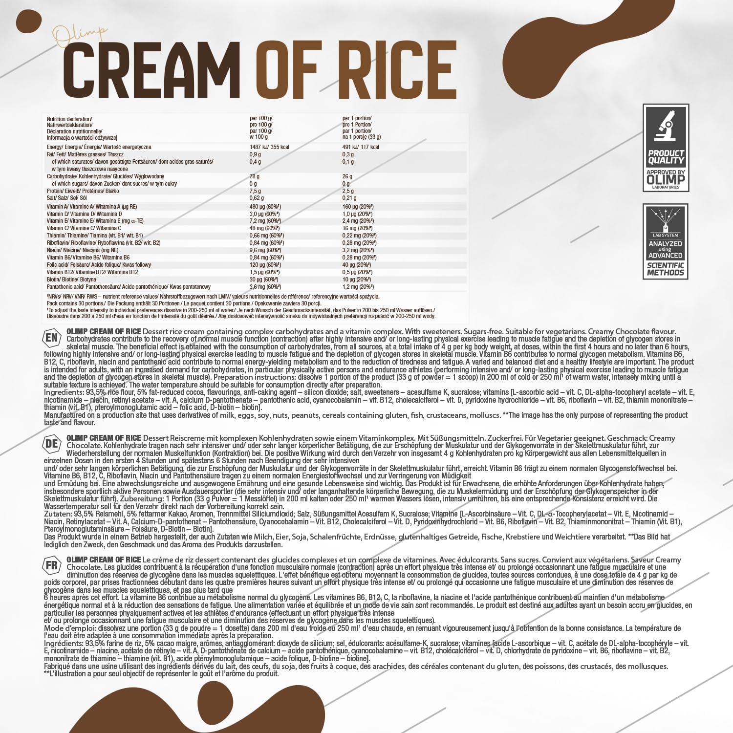 كريمة أوليمب للأرز هي كريمة أرز حلوة غنية بالكربوهيدرات المعقدة ومجموعة فيتامينات. مُحليات. خالية من السكر. مناسبة للنباتيين. بنكهة الشوكولاتة.