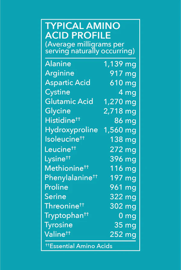 - تحتوي كل ملعقة على 10 جرام من الكولاجين غير المعدّل وراثيًا المستمد من الماشية التي يتم تربيتها في المراعي وتتغذى على العشب: وهذا يعني أنه يمكنك التأكد من أن الكولاجين الخاص بك خالٍ من المضادات الحيوية والهرمونات المضافة.