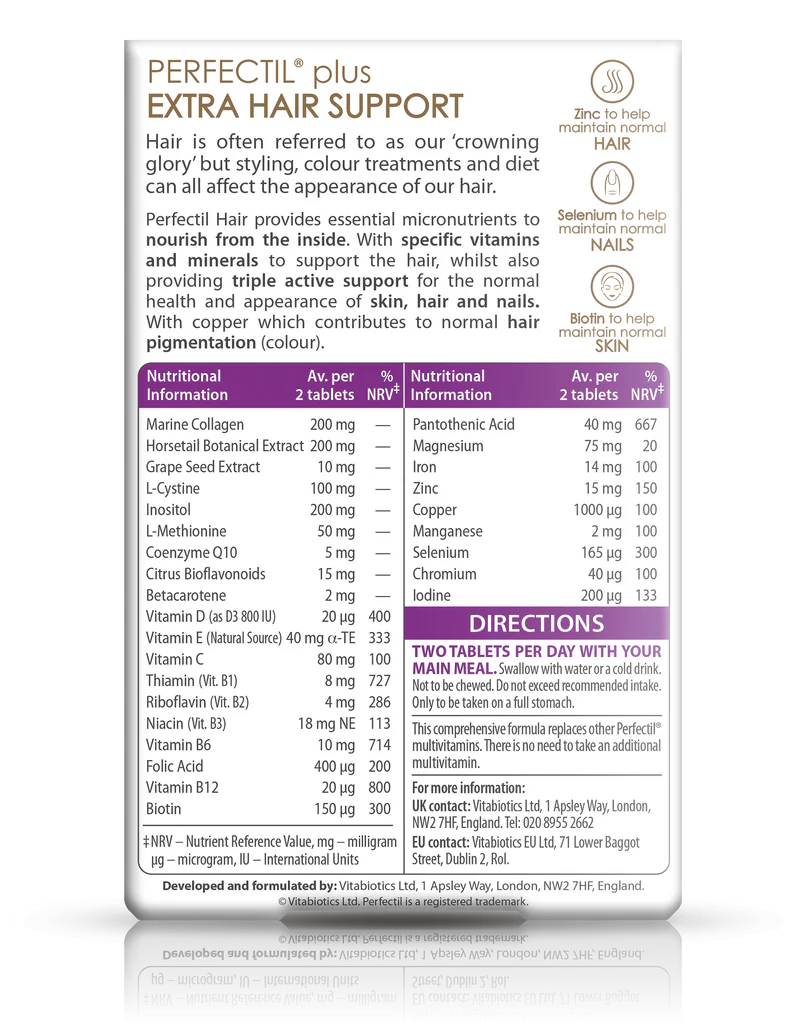 مع إجمالي 28 من المغذيات الدقيقة، التي تم اختيارها خصيصًا لتأثيرها المشترك، يدعم Perfectil Hair جميع مجالات الجمال الرئيسية؛ الجلد والأظافر، مع دعم إضافي لصحة الشعر بما في ذلك:
