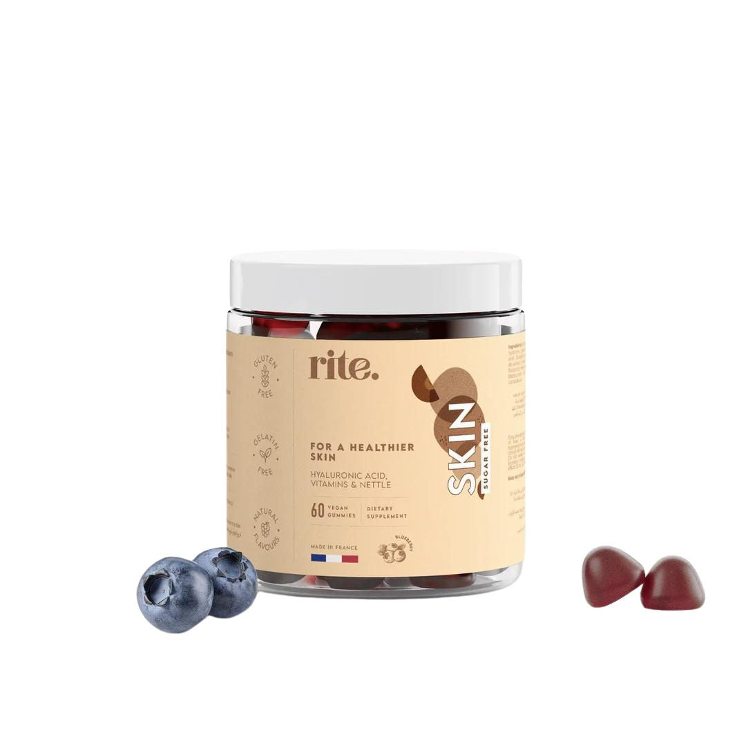 يتم تصنيع حلوى SKIN باستخدام مزيج فريد من المكونات التي تركز على البشرة بما في ذلك جرعة عالية من حمض الهيالورونيك والقراص وفيتامين E وفيتامين A لدعم بشرة أكثر صحة ونظافة عن طريق شفاء الجلد من الداخل.