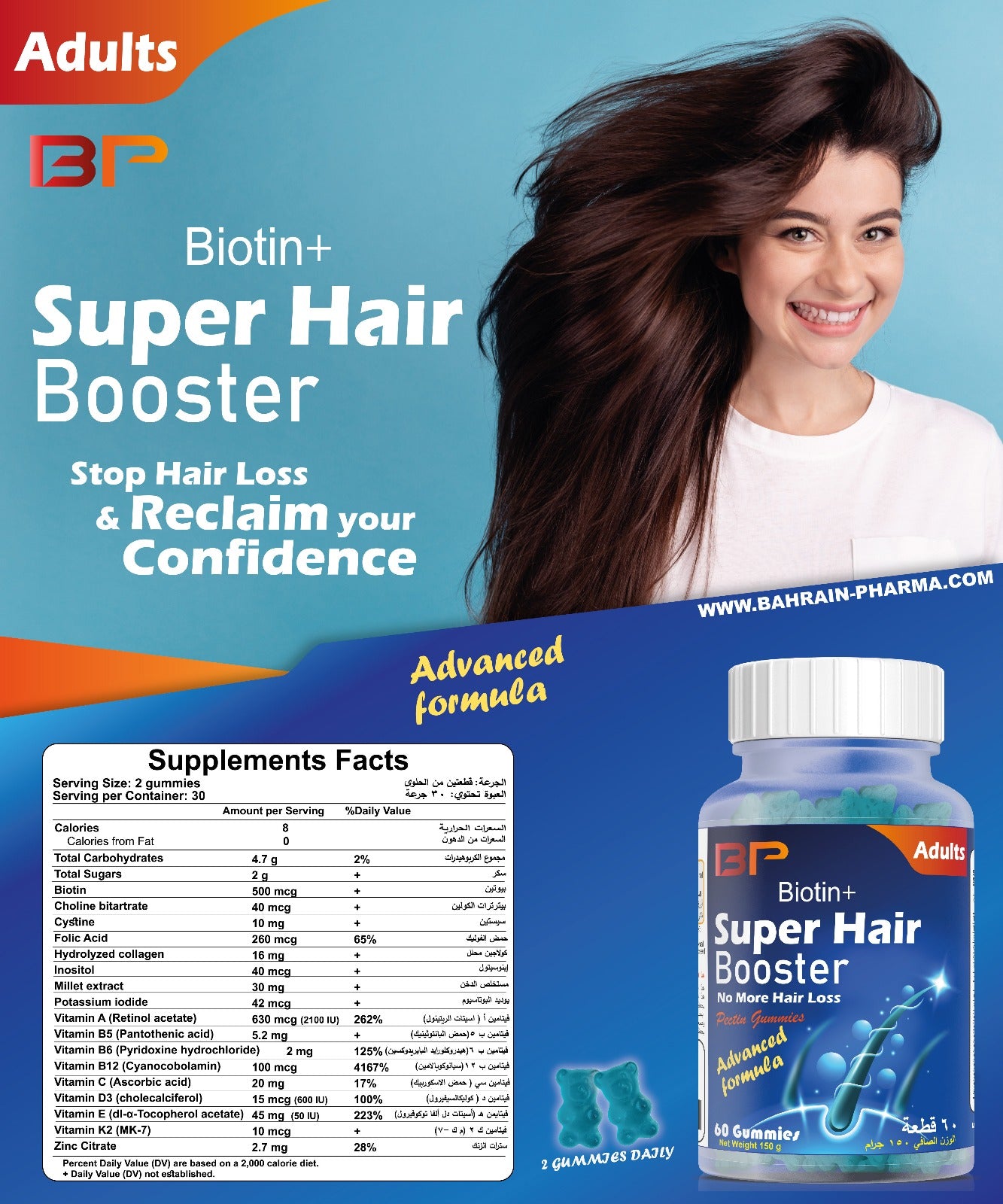 تركيبة طبيعية متوازنة وآمنة وفعالة من الفيتامينات والمعادن ومكونات أخرى مصممة لتحفيز نمو شعر فروة الرأس ومنع المزيد من تساقط الشعر.