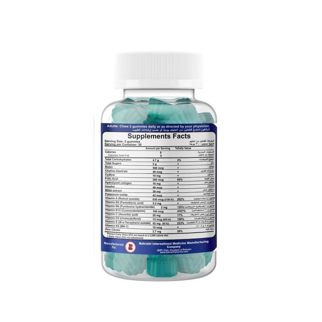 يحتوي المكمل أيضًا على الزنك الذي يدعم نمو الشعر وإصلاحه، حيث ينظم إنتاج الدهون ويحافظ على صحة الغدد الدهنية المحيطة ببصيلات الشعر، مما يجعل الشعر يبدو صحيًا وجميلًا.