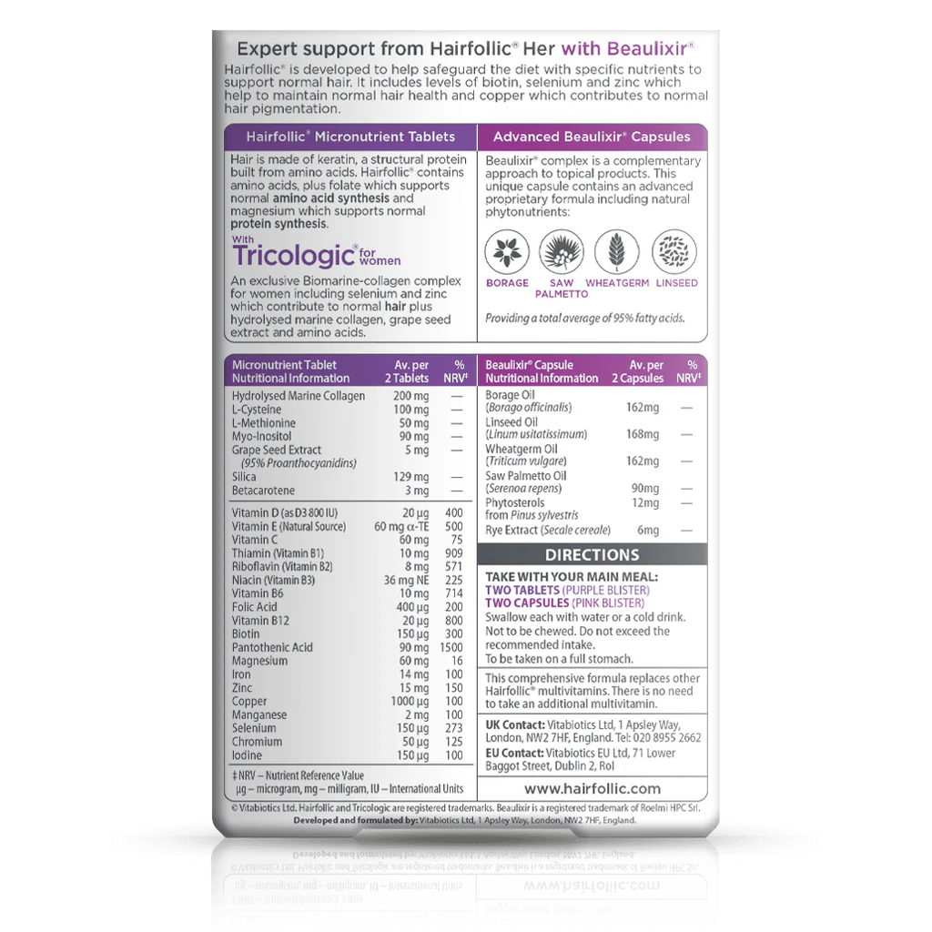 تم تركيب Hairfollic Her علميًا لتوفير مجموعة كاملة من العناصر الغذائية بما في ذلك البيوتين والسيلينيوم والزنك التي تساهم في الحفاظ على الشعر الطبيعي والنحاس الذي يساهم في تصبغ الشعر الطبيعي. يحتوي Hairfollic Her على الكولاجين البحري المحلل، وL-Cysteine ومغذيات خاصة مشتقة من النباتات. مع مركب Tricologic Biomarine، وهو مزيج خاص من السيلينيوم والزنك، بالإضافة إلى مستخلص الكولاجين Biomarine Hydrocollamer القياسي، ومستخلص بذور العنب والسيليكا الغروية. يتم توصيل العناصر الغذائية النشطة بيولوجيًا في Hairfollic Her عبر مجرى الدم مباشرة إلى جذور الشعر لتحقيق أقصى استفادة.