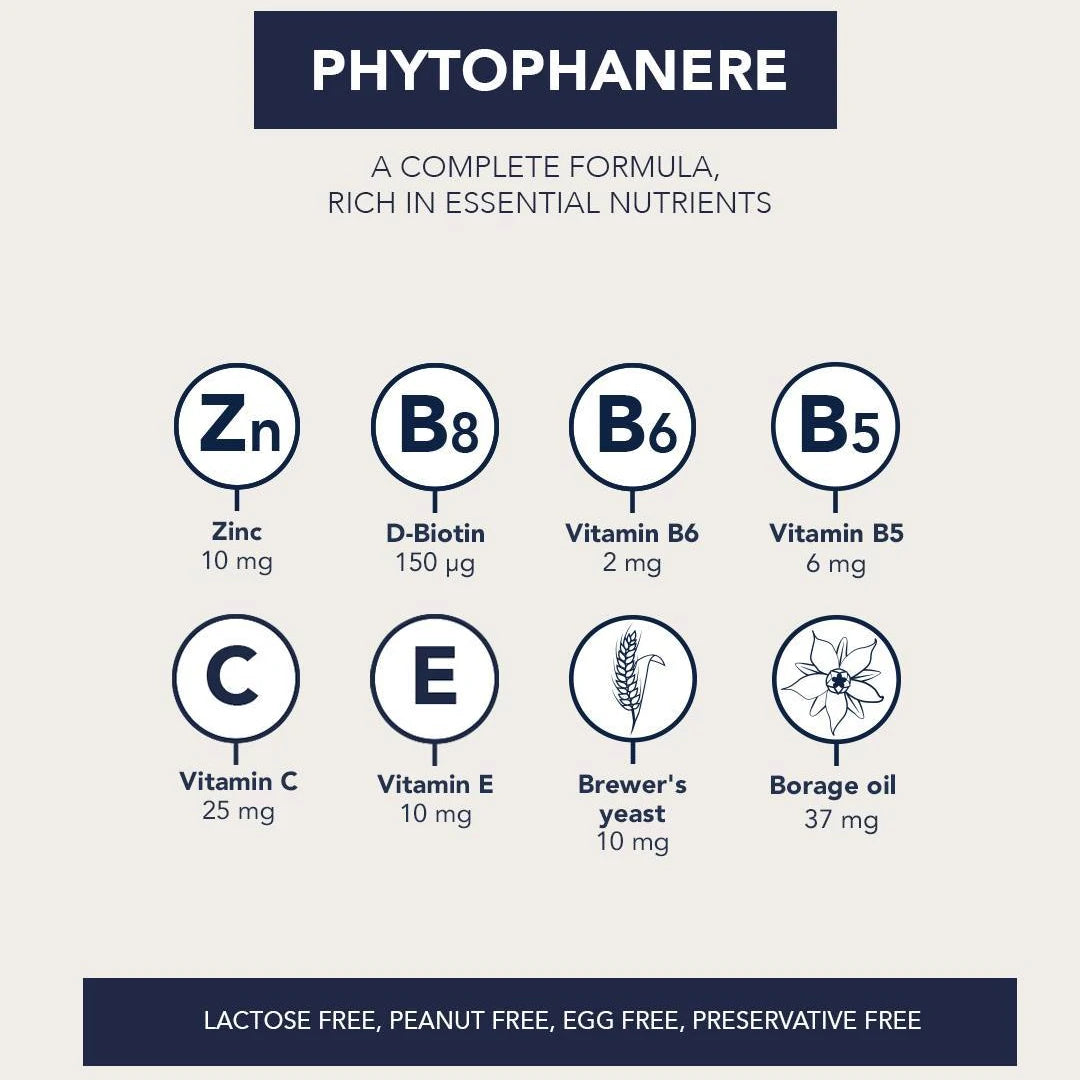 مصنوع من مكونات فعالة نباتية، وأحماض أمينية كبريتية، وفيتامينات ومعادن، كما أنه نباتي وخالي من الغلوتين، ويغطي 80% من احتياجات البيوتين وفيتامين ب8.