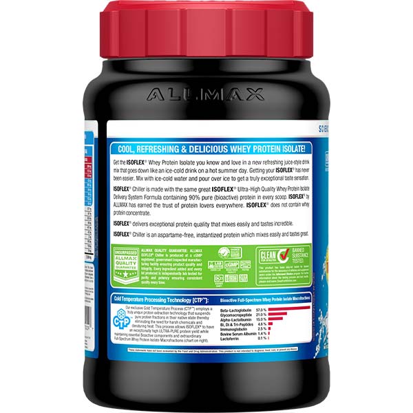 بروتين مصل اللبن المعزول من ISOFLEX Chiller، الذي تعرفه وتحبه، يأتي في مشروب جديد منعش يشبه العصير، يُناسب مشروبًا مثلجًا في يوم صيفي حار. لم يكن الحصول على ISOFLEX أسهل من أي وقت مضى. امزج ISOFLEX Chiller مع الماء المثلج واسكبه فوق الثلج لتحصل على مذاق استثنائي. ISOFLEX Chiller خالٍ من اللاكتوز بنسبة تزيد عن 98%، وعادةً ما يتحمله الأشخاص الذين يعانون من عدم تحمل اللاكتوز.