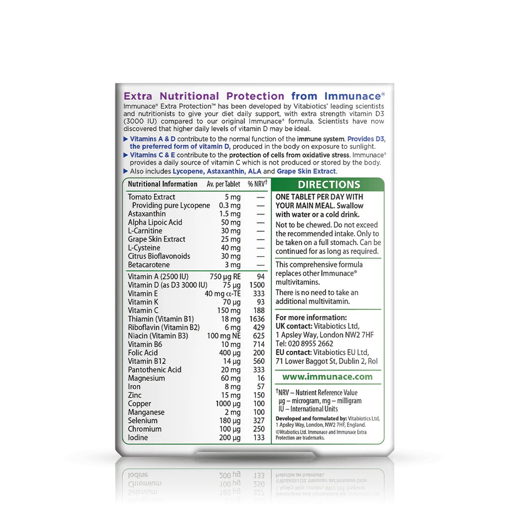 يوفر Immunace Extra Protection تركيبة متقدمة مبنية على الأبحاث تحتوي على 28 عنصرًا غذائيًا، بما في ذلك جميع فوائد تركيبة Immunace الأصلية، بالإضافة إلى عناصر غذائية إضافية، مثل الليكوبين الطبيعي، ومستخلص قشر العنب، والأستازانتين، وحمض ألفا ليبويك، وفيتامين د بتركيز 3000 وحدة دولية. تم تطوير Immunace Extra Protection بواسطة خبراء Vitabiotics، ويمنحك دعمًا غذائيًا إضافيًا بمستوى عالٍ من فيتامين د للمساهمة في الأداء الطبيعي للجهاز المناعي.