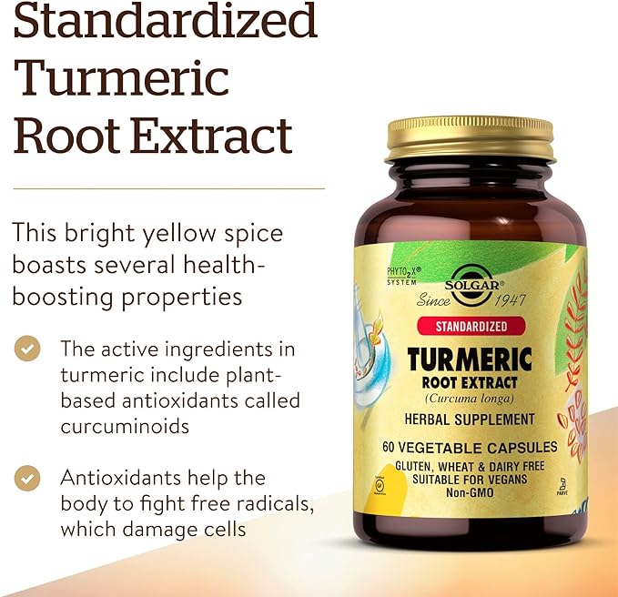 • خالي من الغلوتين والقمح ومنتجات الألبان؛ مستخلص جذر الكركم الموحد من Solgar هو غير معدّل وراثيًا، نباتي، وكوشير، وخالي من: الغلوتين، والقمح، ومنتجات الألبان، وفول الصويا، والخميرة، والسكر، والصوديوم، والنكهة الاصطناعية، والمحليات، والمواد الحافظة، واللون؛ مناسب للنباتيين