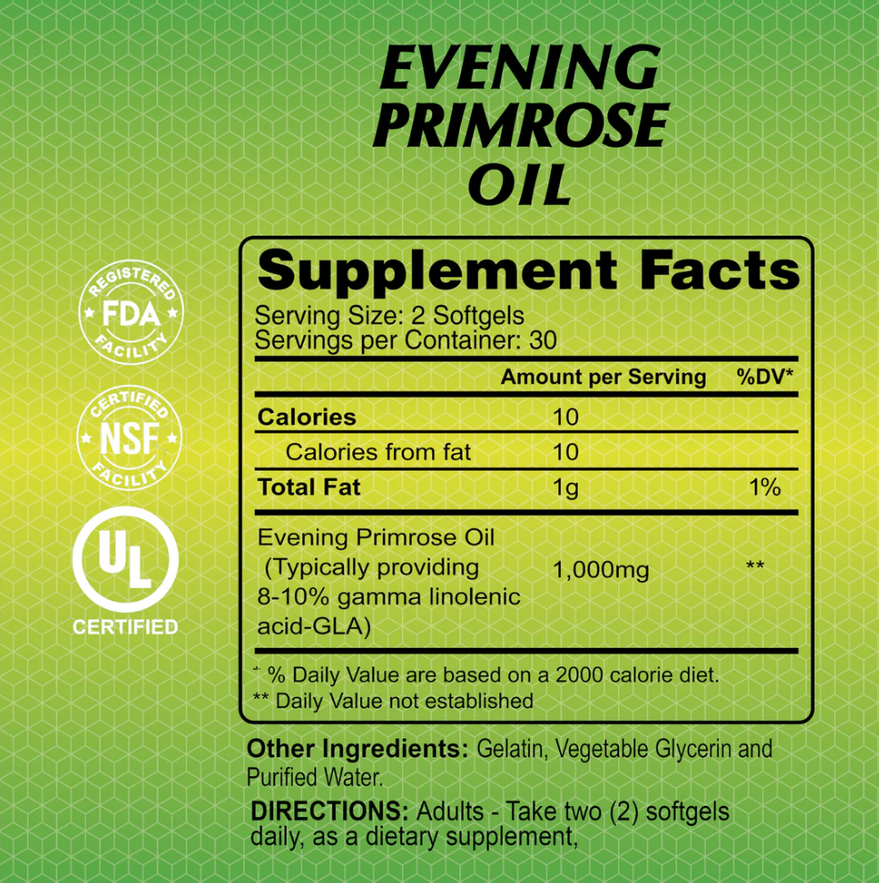 يساعد على دعم صحة المرأة. يتم عصر زيت زهرة الربيع المسائية على البارد من بذور نبات زهرة الربيع المسائية. يحتوي الزيت على حمض جاما لينولينيك (GLA) وأحماض أوميجا 6 الدهنية الأخرى التي لها خصائص مضادة للالتهابات. تحتوي كل كبسولة هلامية على مستوى مركز من حمض GLA، وهو حمض دهني قد يساعد في دعم البشرة الجافة وصحة الجهاز الهضمي والمساعدة في التخلص من السموم. يتم تناول هذا المكمل لعلاج متلازمة ما قبل الحيض (PMS)، أو الأعراض التي تسبق الدورة الشهرية، أو الانتقال إلى انقطاع الطمث، أو نهاية الدورة الشهرية. يدعم الجهاز الهضمي ينظف ويزيل السموم ويدعم صحة البشرة، زيته هو مصدر طبيعي لحمض دهني أساسي يسمى حمض جاما لينولينيك أو أوميغا 6.