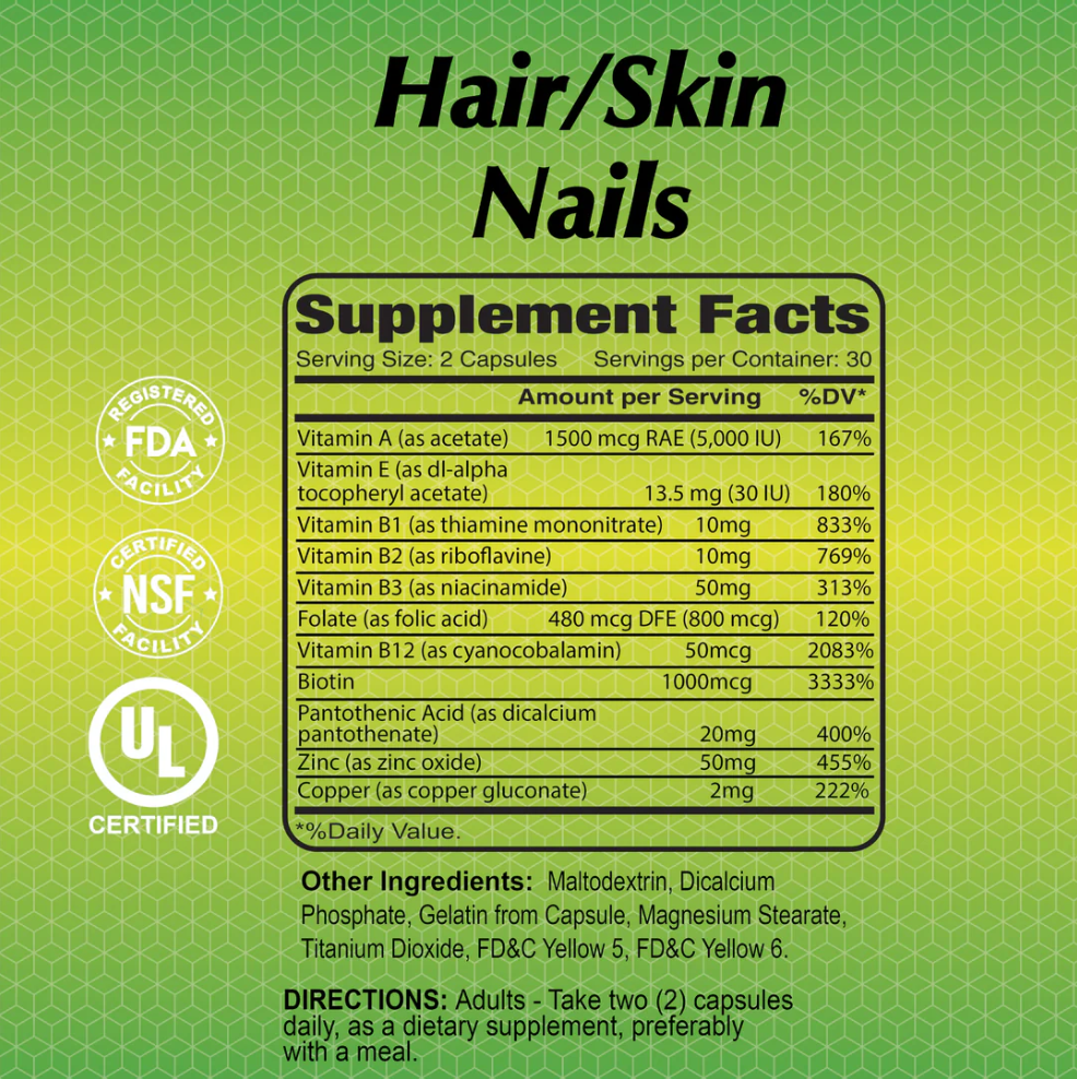 تركيبة تعتمد على الفيتامينات والمعادن الضرورية لصحة الجلد والشعر والجهاز العصبي وحيوية الخلايا بشكل عام.