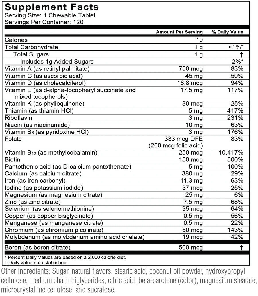 تعتمد أقراص الكل في واحد القابلة للمضغ على أحدث الإرشادات التي أصدرتها الجمعية الأمريكية لجراحة التمثيل الغذائي وجراحة السمنة (ASMBS) بعد العملية الجراحية لتوفير أكثر من 20 فيتامينًا ومعدنًا أساسيًا. بارياتريكبال متعدد الفيتامينات