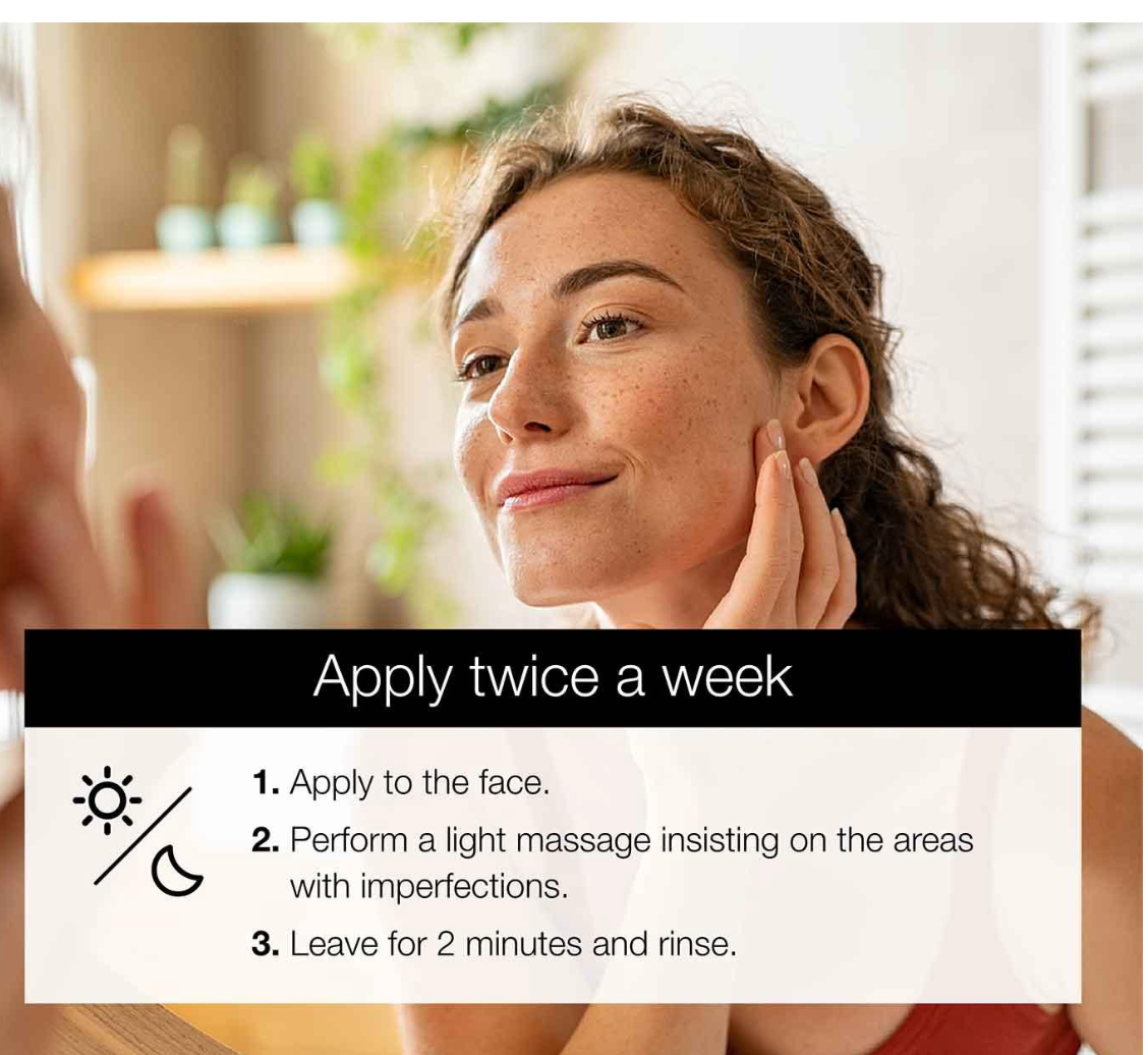 يُوضع على الوجه مرة أو مرتين أسبوعياً. يُدلك بلطف، خاصةً على المناطق التي بها شوائب، ويُترك لبضع دقائق قبل شطفه بكمية وفيرة من الماء الفاتر. للاستخدام الخارجي فقط. تجنبي ملامسة العينين مباشرةً. يُحفظ بعيداً عن الحرارة مع إغلاق الغطاء بإحكام. لطيف على البشرة والطبيعة. مُختبر من قبل أطباء الجلدية.