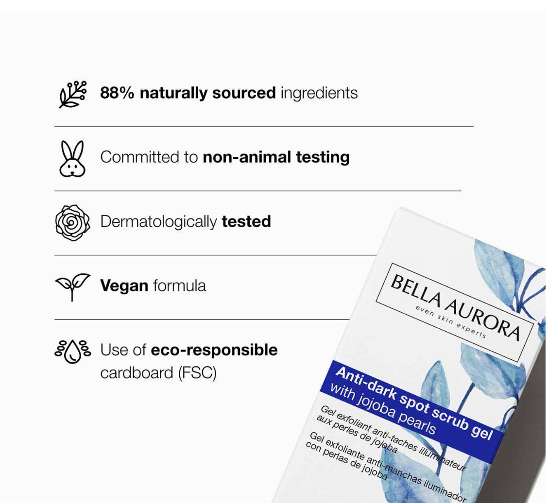 جل مقشر مضاد للبقع الداكنة مع لآلئ الجوجوبا، يحفز عملية تجديد الخلايا عن طريق التقشير بطريقتين لتفتيح البقع الداكنة وتوحيد لون البشرة. يُسرّع إزالة البقع الداكنة ويوحد لون البشرة عن طريق تعزيز امتصاص المواد الفعالة. يحفز تجديد الخلايا ويمنع شيخوخة البشرة .