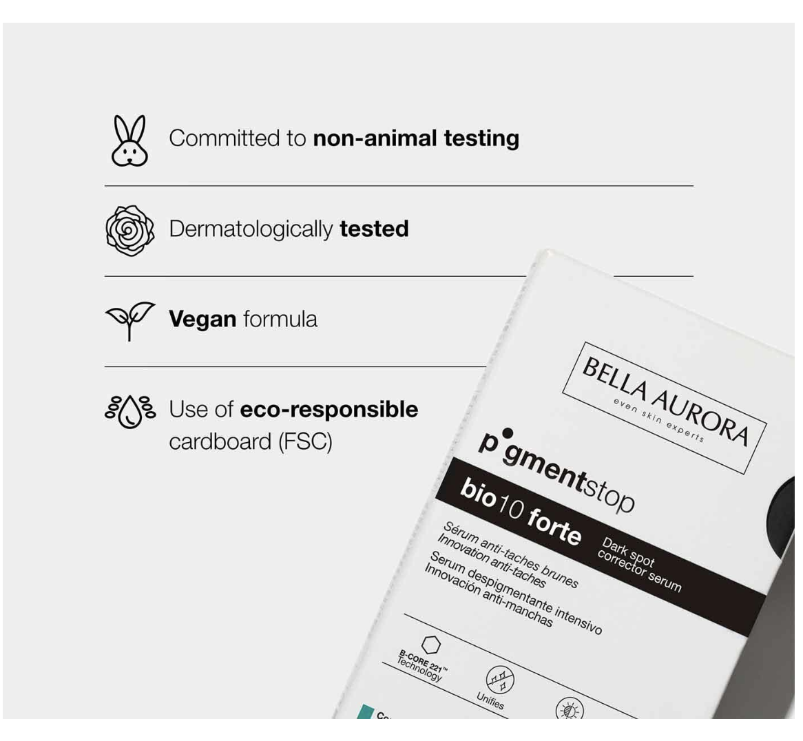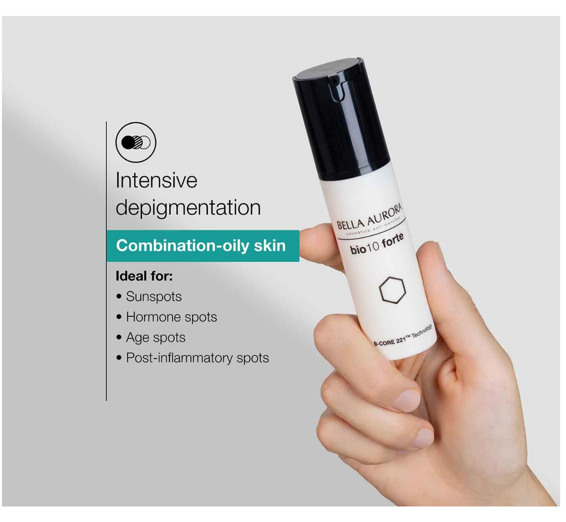 سيروم Bio10 forte لتصحيح البقع الداكنة للبشرة المختلطة والدهنية هو علاج مكثف للبقع الداكنة بتقنية B-CORE 221 الحصرية لإزالة التصبغات. يعمل هذا السيروم على إيصال المكون المُغلف لإزالة التصبغات مباشرةً إلى الخلايا المنتجة للميلانين، حيث يتم إطلاقه لتحقيق أقصى فعالية. يوفر عناية خاصة للتحكم في إفراز الدهون للبشرة المختلطة والدهنية، بمكونات خالية من الزيوت ولمسة نهائية غير لامعة لموازنة المسام وتقليلها.