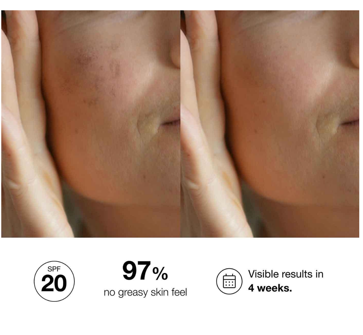 حماية من أشعة الشمس بمعامل حماية 20، تشمل الأشعة فوق البنفسجية UVA وUVB والأشعة تحت الحمراء (IR) والضوء المرئي (HEV).