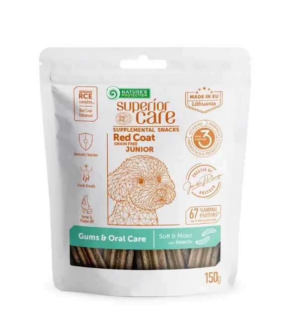 Nature's Protection Superior Care Red Coat – وجبات خفيفة تكميلية للعناية باللثة والفم مع الحشرات (للكلاب الصغيرة، 150 غرام)