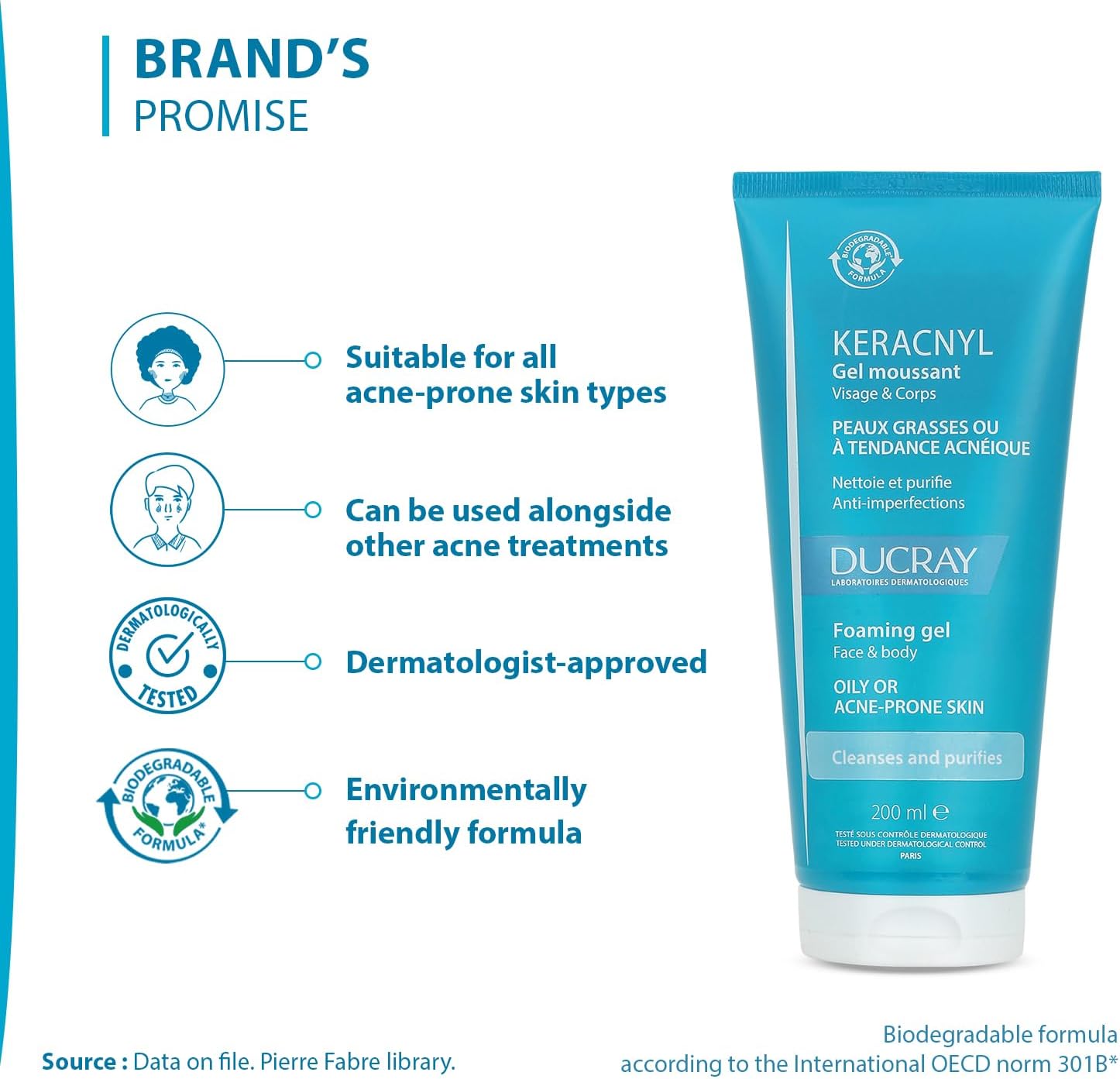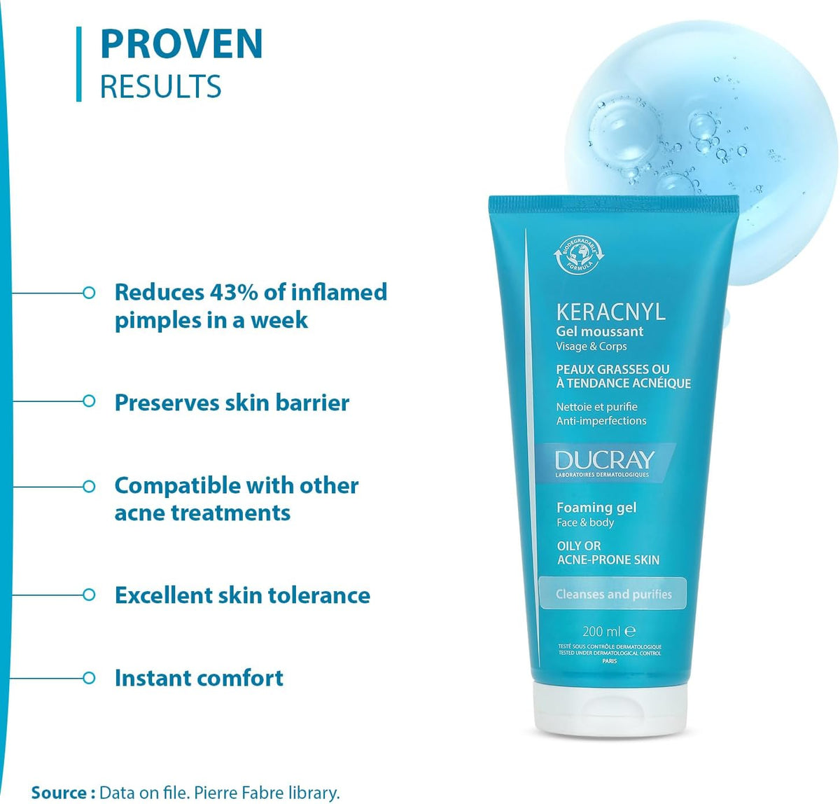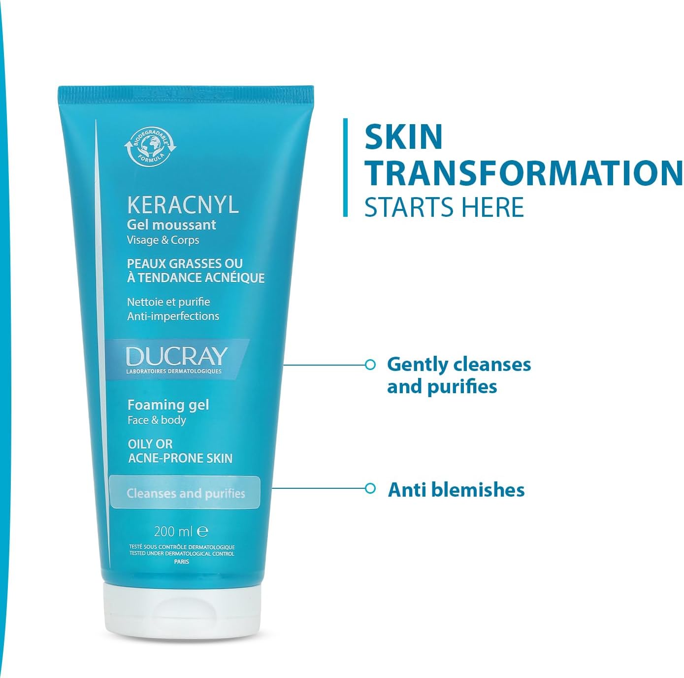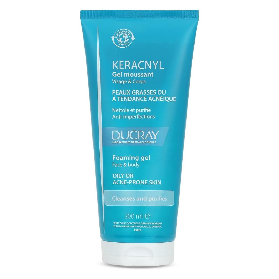 جل KERACNYL الرغوي هو منظف يومي للوجه والجسم مناسب للبشرة الدهنية و/أو المعرضة لحب الشباب لدى المراهقين والبالغين.