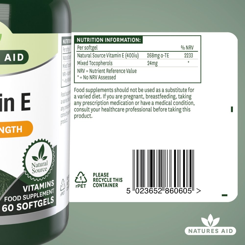 تحتوي كل كبسولة على 400 وحدة دولية من فيتامين E الطبيعي على شكل د-ألفا توكوفيرول، وهو الشكل الأكثر امتصاصًا من فيتامين E الطبيعي.