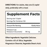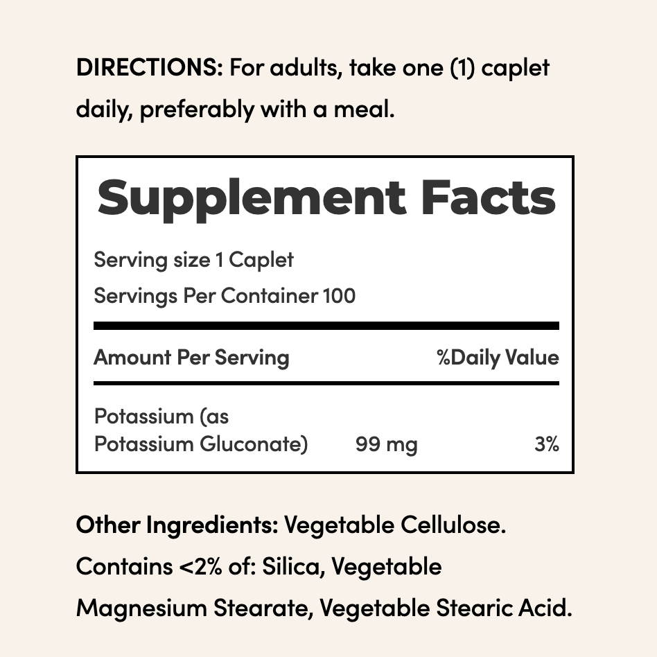 البوتاسيوم هو معدن أساسي يعمل مع الصوديوم لتنظيم توازن الماء في الجسم.* كما أنه يساعد في توازن المعادن في الدم، ويدعم نشاط العضلات وهو ضروري لعملية التمثيل الغذائي للكربوهيدرات والبروتين.*