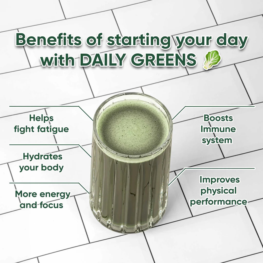 نريد أن يتناسب منتج Daily Greens جيدًا مع روتينك اليومي. يمكنك أيضًا تناوله في العصائر أو إضافته إلى الكولاجين أو مسحوق البروتين أو ببساطة مزجه مع الزبادي! بالنسبة للأشخاص الذين يجدون الطعم قويًا، فإن الأفضل هو زيادة كمية الماء لجعله أخف أو مزجه مع عصير التفاح على سبيل المثال.