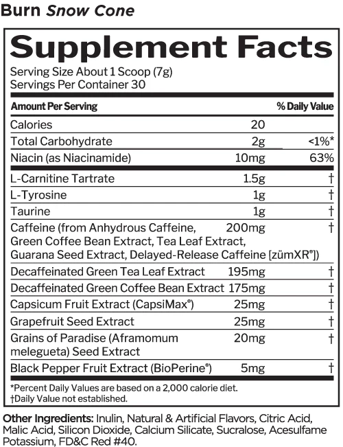 يحتوي بيرن على مزيج رائع من المكونات الحرارية، بما في ذلك مزيج متعدد الكافيين، مشتق من مصادر لا مائية، وحبوب البن، وأوراق الشاي، وبذور الغوارانا، ومصادر مغلفة بدقة ومتأخرة الإطلاق. توفر جرعة واحدة من المسحوق أو الكبسولات طاقة تعادل حوالي كوبين من القهوة القوية.