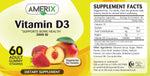 Amerix Vitamin D 3 gummies help support bone health. These delicious gummies come in three fantastic naturally derived flavors which include Strawberry, Peach and Mango. They are Vegetarian, Kosher, Halal and contain no Gelatin.