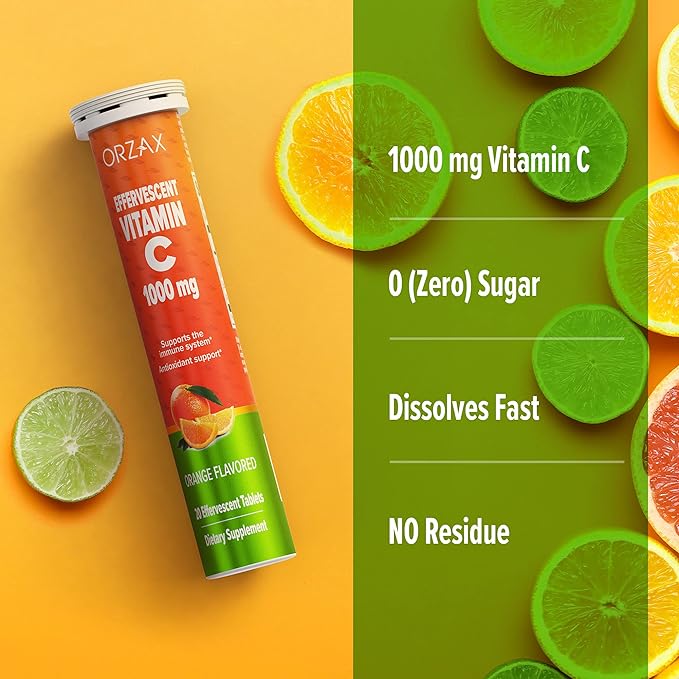 Orzax Effervescent Vitamin C contains 1000 mg of vitamin C in each effervescent tablet and offers you an easy and efficient way to ensure you meet your daily vitamin C requirements. Just dissolve the effervescent tablets in water and enjoy a great-tasting and refreshing drink. These effervescent vitamins dissolve quickly and do not leave a residue.