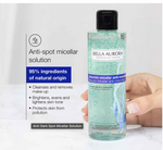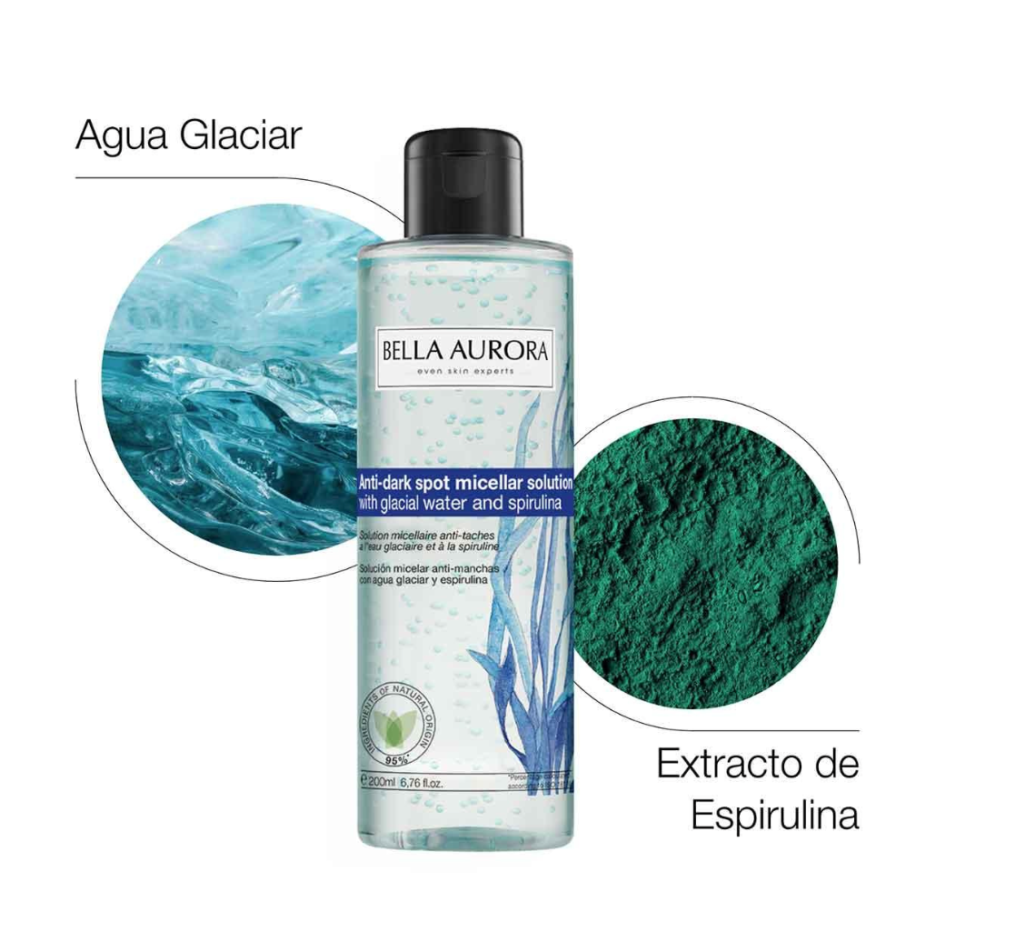Anti-dark spot micellar solution cleanses, removes make-up, eliminates impurities and brightens skin in a single step. With anti-dark spot and anti-pollution ingredients. Contains anti-pollution ingredients, protects the skin from environmental damage and premature ageing. Enriched with glacial water and spirulina, it leaves the skin soft and supple. 95% ingredients of natural origin (percentage calculated according to ISO 16128). Dermatologically tested.