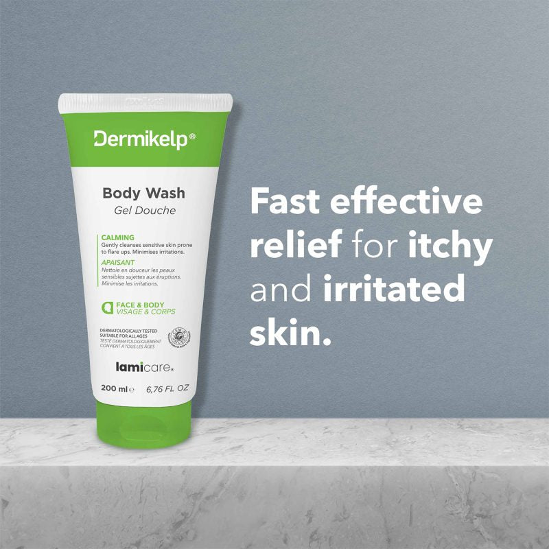 Dermikelp® Body Wash contains CEM-K a natural active ingredient from kelp. When the skin reacts to a negative stimulus, the CEM-K decreases the IgE secretion which prevents histamine from being released and an allergic reaction from taking place. This reduces the redness and itching.