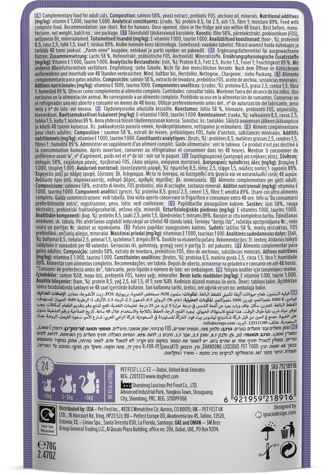 Composition: salmon 58%, yeast extract, prebiotic FOS, anchovy oil, minerals.