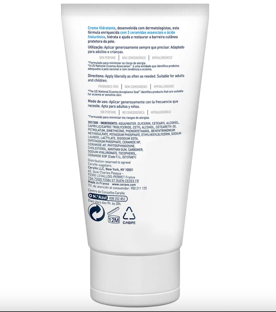 • AQUA / WATER / EAU, GLYCERIN, CETEARYL ALCOHOL, CAPRYLIC/CAPRIC TRIGLYCERIDE, CETYL ALCOHOL, CETEARETH-20, PETROLATUM , POTASSIUM PHOSPHATE, CERAMIDE NP, CERAMIDE AP, CERAMIDE EOP, CARBOMER, DIMETHICONE , BEHENTRIMONIUM METHOSULFATE, SODIUM LAUROYL LACTYLATE, SODIUM HYALURONATE, CHOLESTEROL, PHENOXYETHANOL, DISODIUM EDTA, DIPOTASSIUM PHOSPHATE, TOCOPHEROL, PHYTOSPHINGOSINE, XANTHAN GUM, ETHYLHEXYLGLYCERIN
