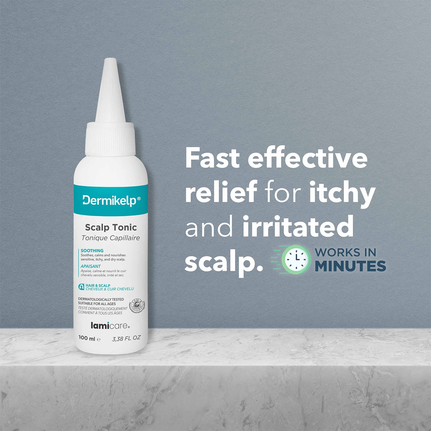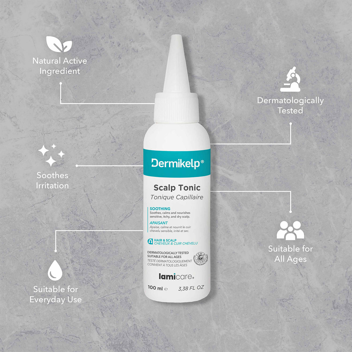 Dermikelp® Soothing Scalp Tonic contains CEM-K a natural active ingredient from kelp. When the skin reacts to a negative stimulus, the CEM-K decreases the IgE secretion which prevents histamine from being released and an allergic reaction from taking place. This reduces the redness and itching.