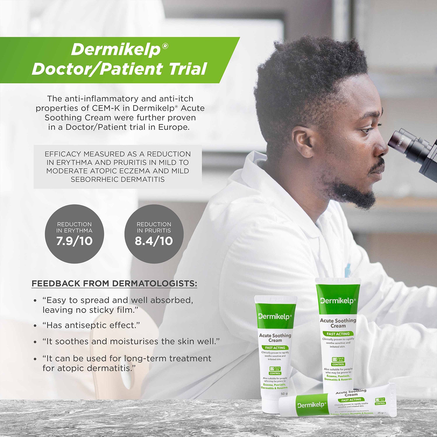 Dermikelp® Acute Soothing Cream contains CEM-K a natural active ingredient from kelp. When the skin reacts to a negative stimulus, the CEM-K decreases the IgE secretion which prevents histamine from being released and an allergic reaction from taking place. This reduces the redness and itching.