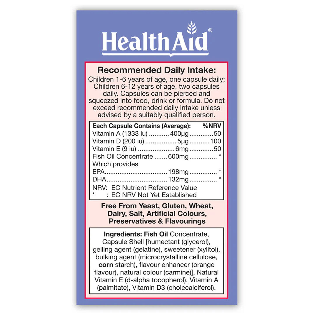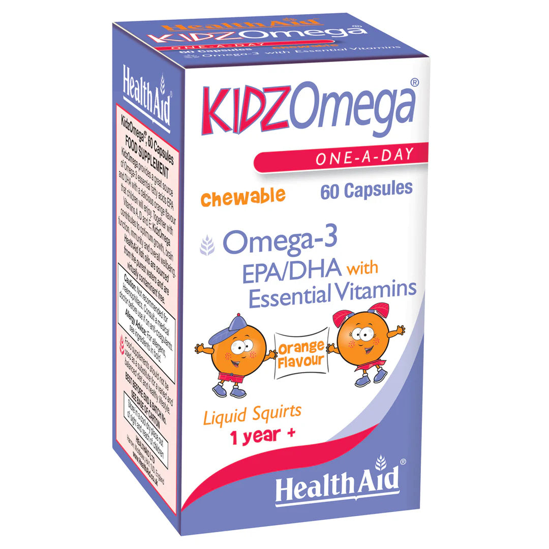 KidzOmega Capsules provide a great source of Omega-3 essential fatty acids EPA and DHA. Eicosapentaenoic acid (EPA) and docosahexaenoic acid (DHA) contribute to the normal function of the heart and brain and normal vision. KidzOmega Capsules is enriched with Vitamins A, D and E to benefit your child's health.