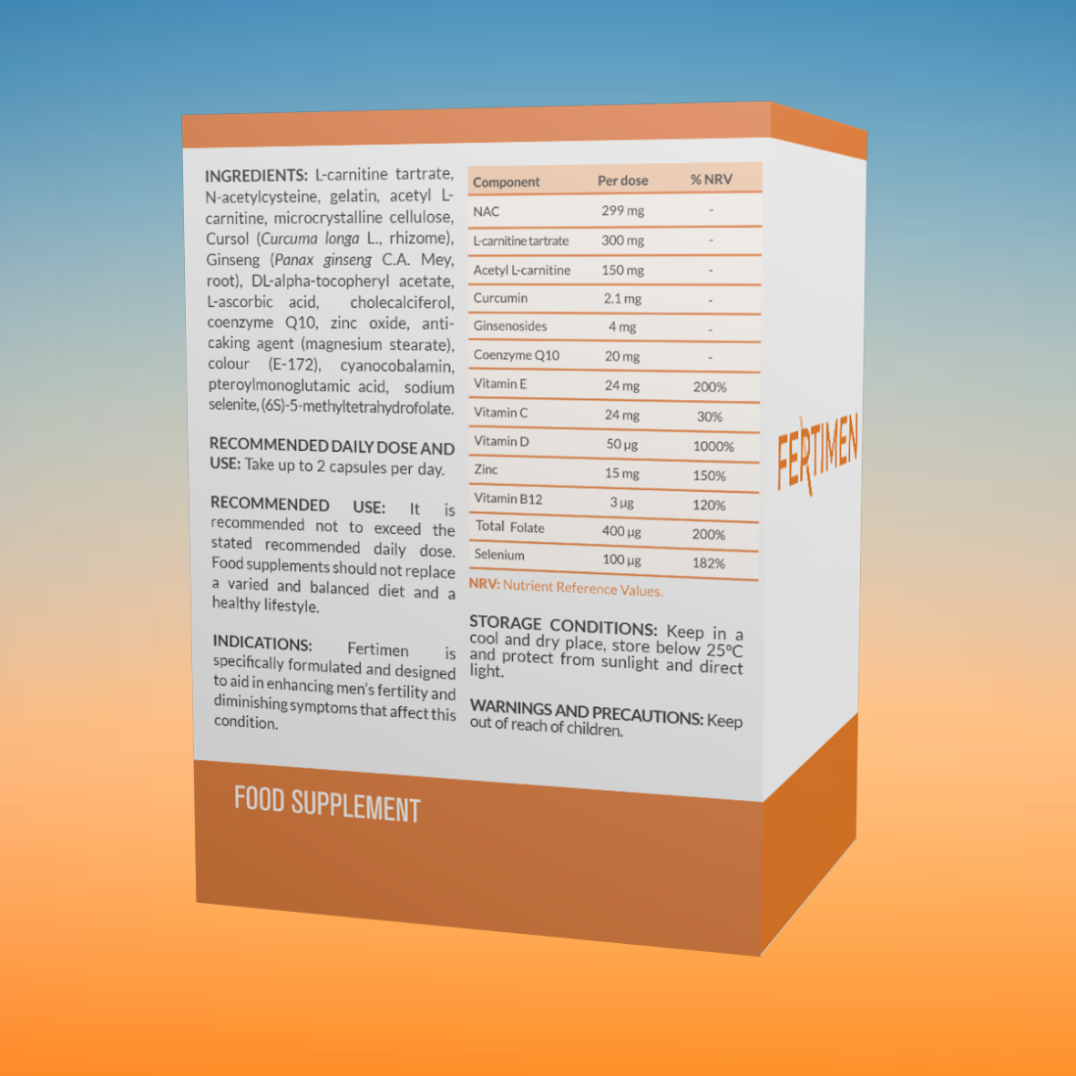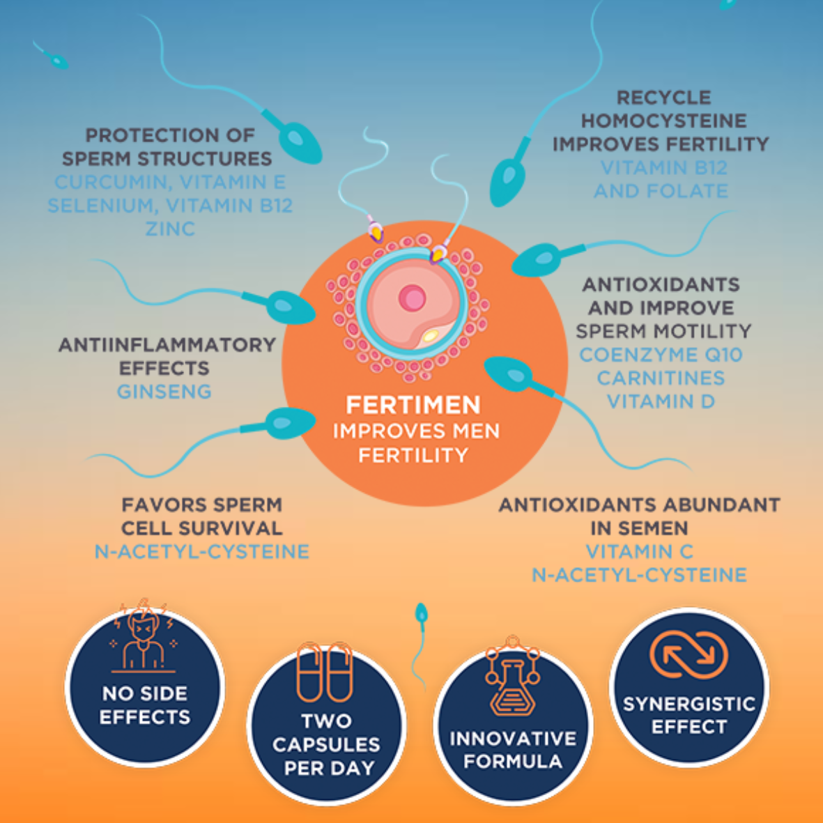 FERTIMEN provides a potent antioxidant complex made of Coenzyme Q10, Turmeric, Ginseng, N-acetyl cysteine, Carnitines and vitamins and minerals that help to increase seminal concentration, sperm concentrations and sperm motility and vitamins and minerals to maintenance of normal testosterone levels in the blood, normal DNA synthesis and the protection of cells from oxidative stress.