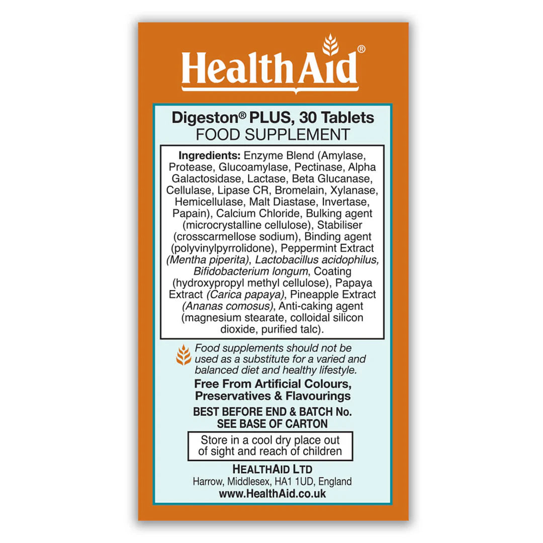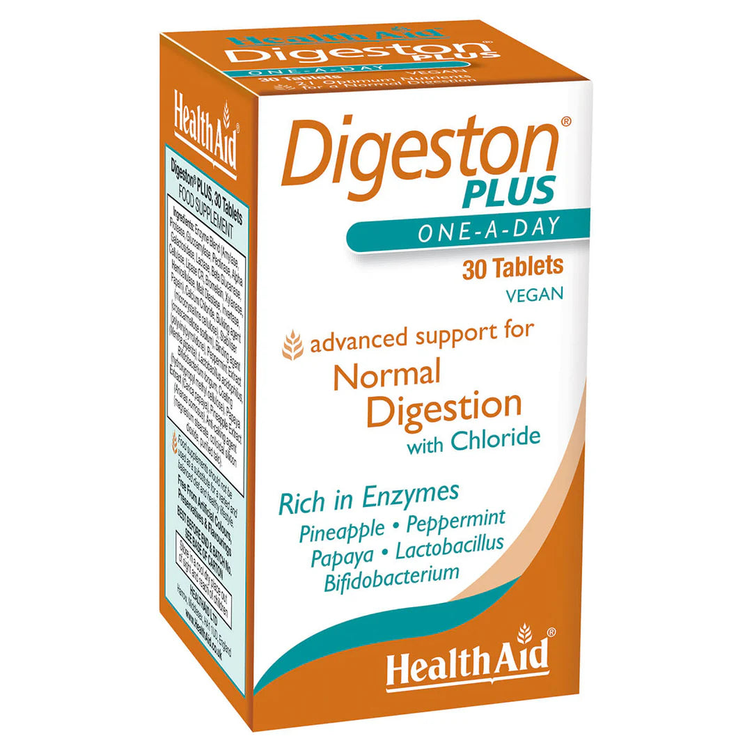 HealthAid® Digeston Plus is a unique blend of purely vegan digestive enzymes combined with fruit extracts such as Pineapple and Papaya, which are well known for their naturally occurring digestive enzymes and their function in the breakdown of food. The formula is boosted with a superior blend of 600 million viable bacterial strains of Lactobacillus and Bifidobacterium to help replenish the body’s good bacteria. Last but not least, the formulation contains Chloride in the form of Calcium chloride, which contributes to healthy digestion.