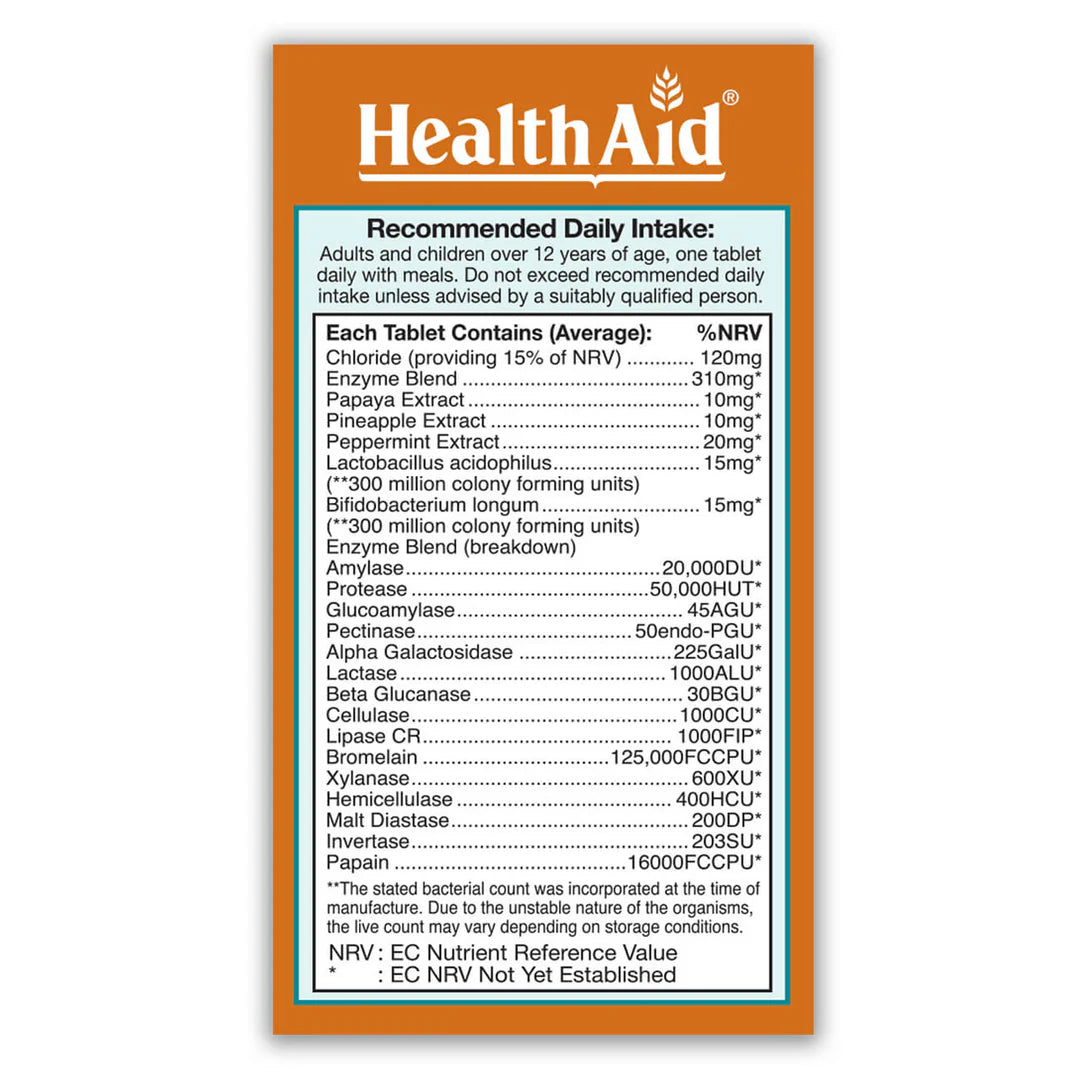 Enzyme Blend (Amylase, Protease, Glucoamylase, Pectinase, Alpha Galactosidase, Lactase, Beta-Glucanase, Cellulase, Lipase CR, Bromelain, Xylanase, Hemicellulase, Malt Diastase, Invertase, Papain), Calcium Chloride, Bulking agent (microcrystalline cellulose), Stabiliser (crosscarmellose sodium), Binding agent(polyvinylpyrrolidone), Lactobacillus acidophilus, Bifidobacterium longum, Coating (hydroxypropyl methyl cellulose),Anti-caking agent (magnesium stearate, colloidal silicon dioxide, purified talc).