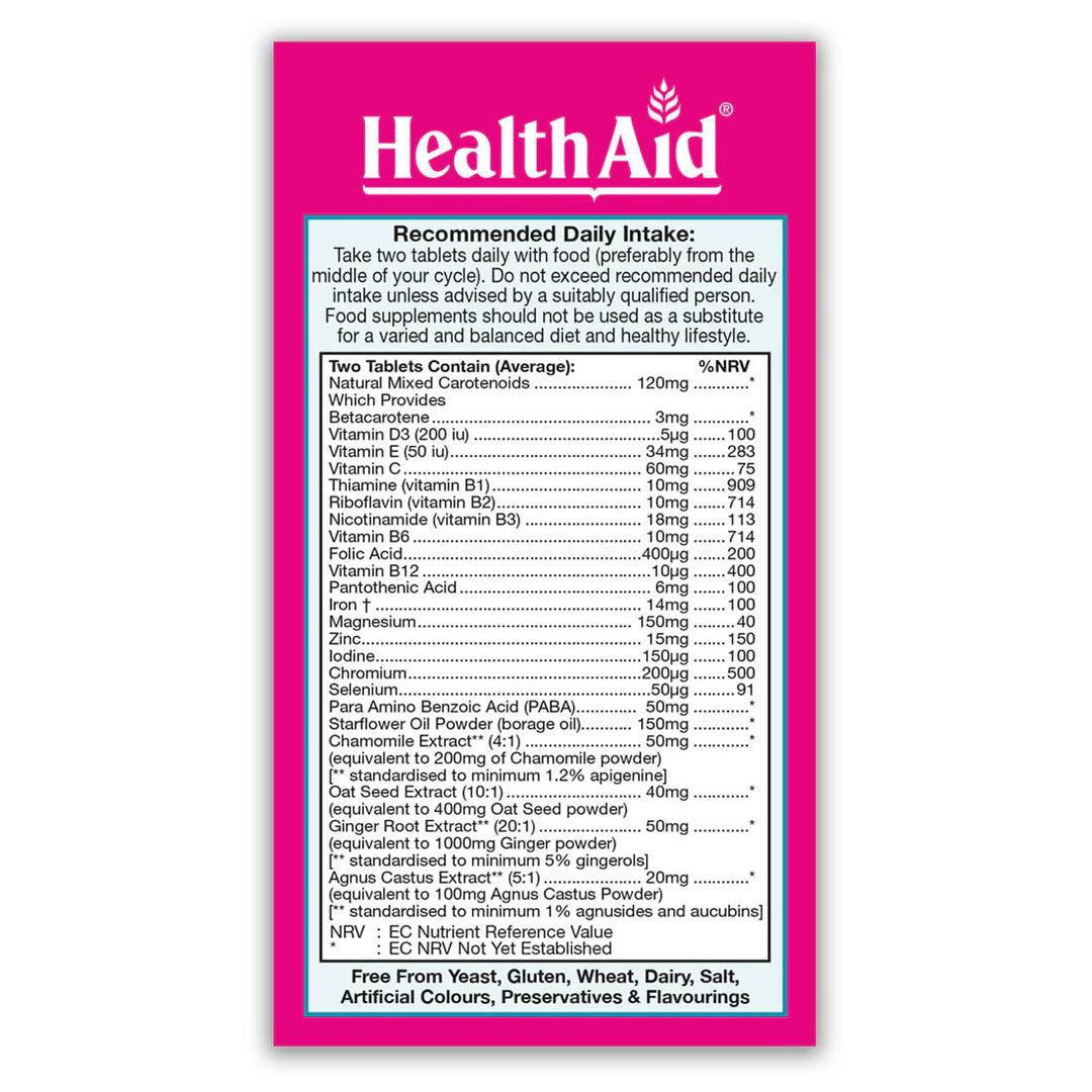• Bulking Agent (di-calcium phosphate, microcrystalline cellulose), Magnesium Oxide, Borage Seed Oil Powder (Borago officinalis), Mixed Carotenoids, Natural Vitamin E (d-alpha-tocopherol), Vitamin C (ascorbic acid), Anti-caking Agent (silica, veg. magnesium stearate), Para Amino Benzoic Acid (PABA), Chamomile Flower Extract (Matricaria recutita), Ginger Root Extract (Zingiber officinalis), Iron† (ferrous fumerate), Zinc Citrate, Oat Seed Extract (Avena sativa), Agnus Castus Berry Extract (Vitex agnus castus), Nicotinamide (vitamin B3), Pyridoxine HCl (vitamin B6), Thiamine HCl (vitamin B1), Riboflavin (vitamin B2), Pantothenic Acid (calcium pantothenate), Vitamin D3 (cholecalciferol), Chromium Chloride, Folic Acid, Potassium Iodide, Sodium Selenite, Vitamin B12 (cyanocobalamin), Glazing Agent [hydroxy propyl methyl cellulose (HPMC)].
