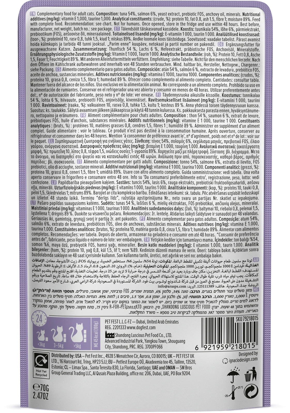 Composition: tuna 54%, salmon 6%, yeast extract, prebiotic FOS, anchovy oil, minerals.