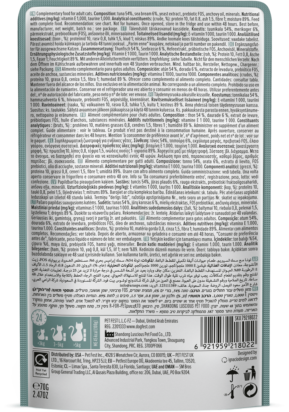 An exquisite meal of wild Pacific tuna and sea bass will allow your pet to experience and appreciate the true taste of Pacific delicacies. The delicate jelly only enhances the refined flavor.
