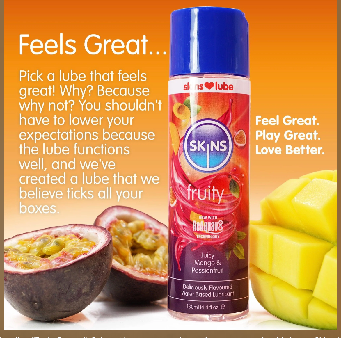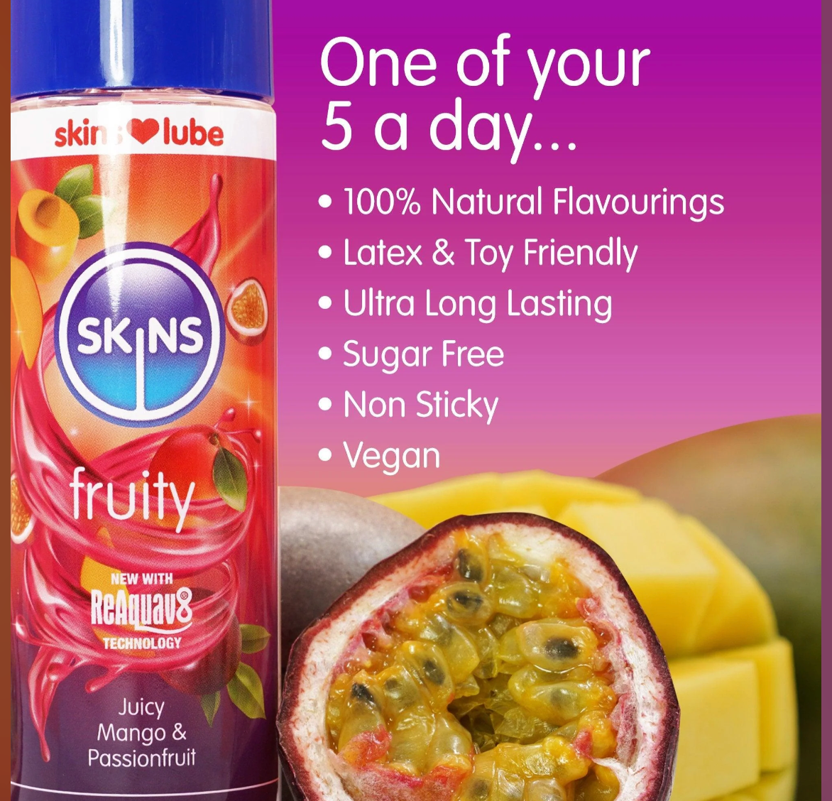 Juicy Mango & Passionfruit Flavoured Water Based Lubricant for fruity fun. An oasis of thirst-quenching delights, Skins Fruity Lubes actually taste like real fruit and have none of the after taste that can be sometimes associated with flavoured lubes. Bursting with fruity goodness, they come in three delicious flavours, Sensual Strawberry, Juicy Mango and Passionfruit and Refreshing Watermelon.