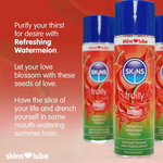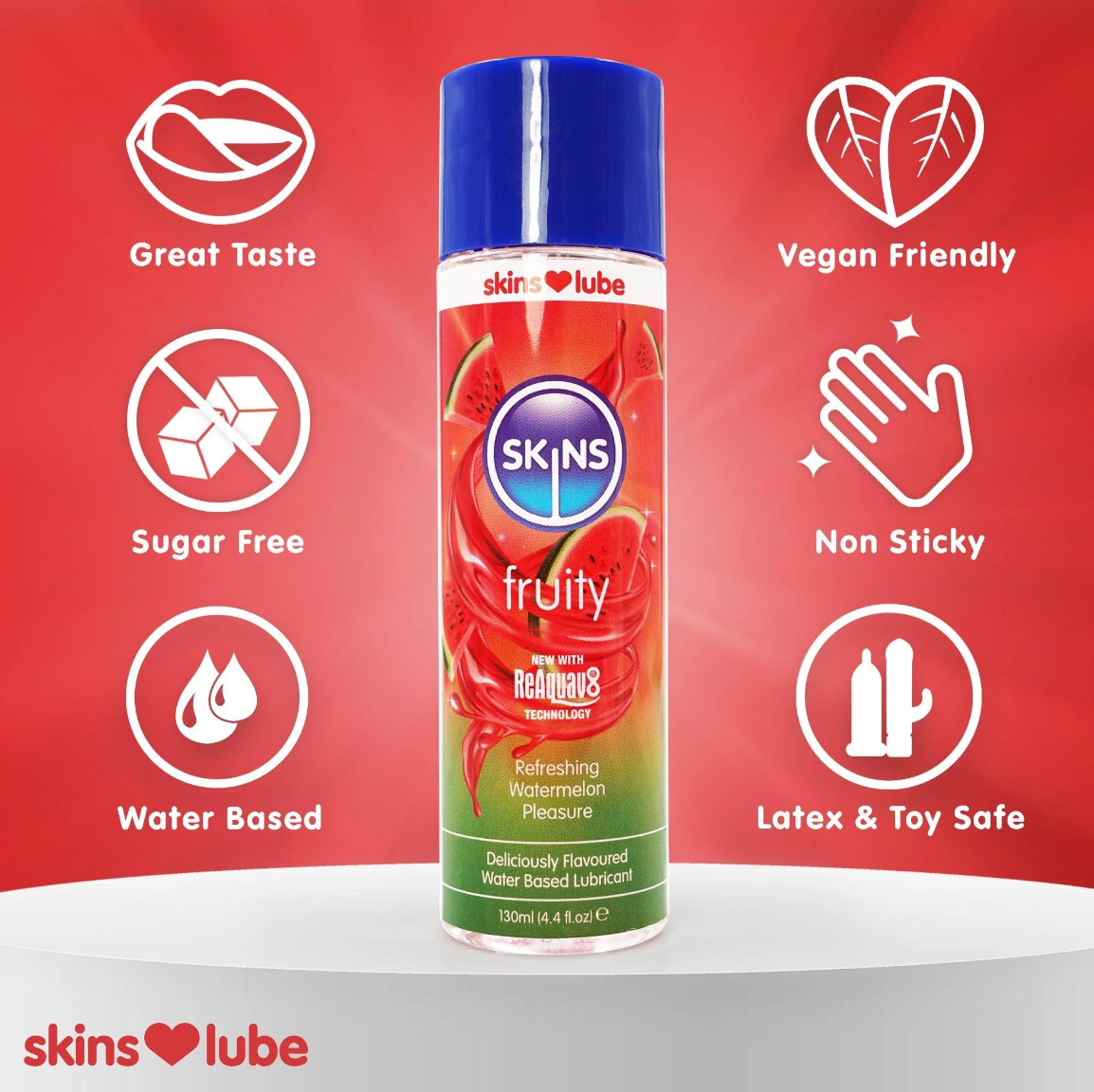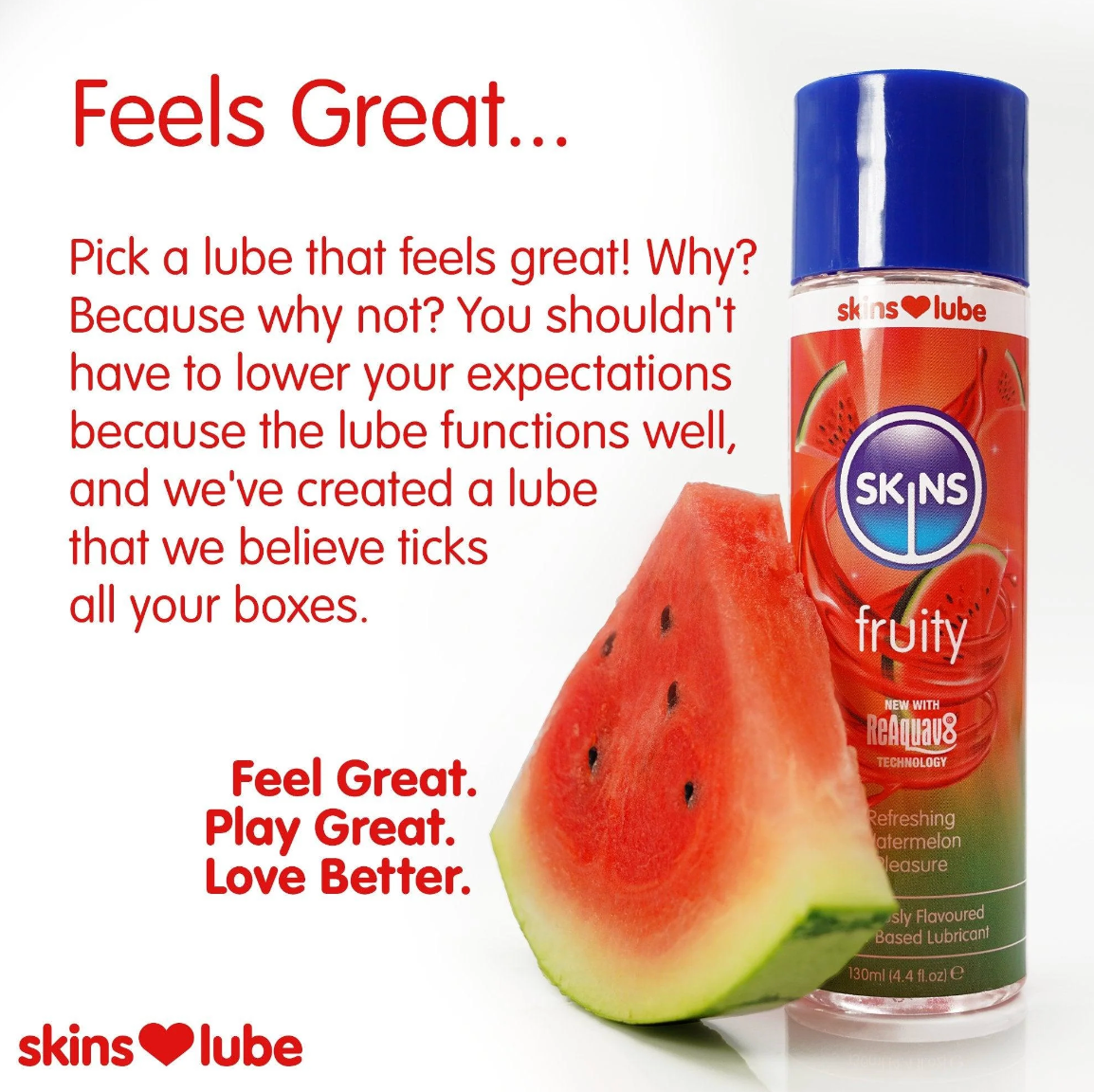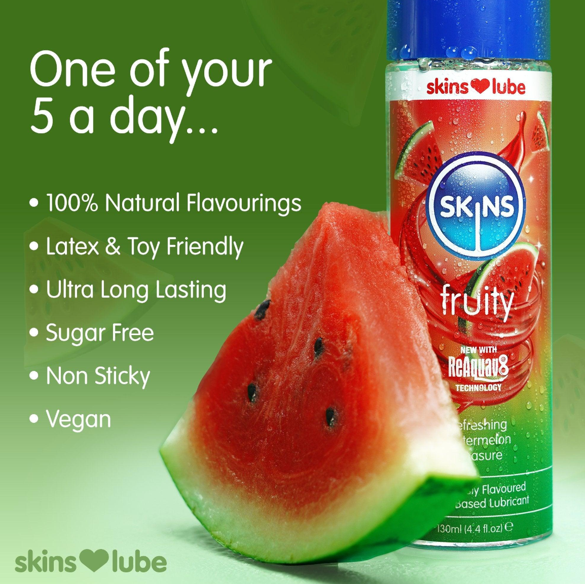 Refreshing Watermelon Flavoured Water Based Lubricant for fruity fun An oasis of thirst-quenching delights, Skins Fruity Lubes actually taste like real fruit and have none of the after taste that can sometimes be associated with flavoured lubes. Bursting with fruity goodness, they come in three delicious flavours, Sensual Strawberry, Juicy Mango and Passionfruit and Refreshing Watermelon.