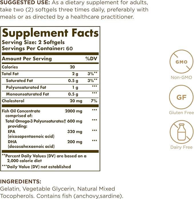 As a dietary supplement for adults, take two (2) softgels three times daily, preferably with meals or as directed by a healthcare practitioner.