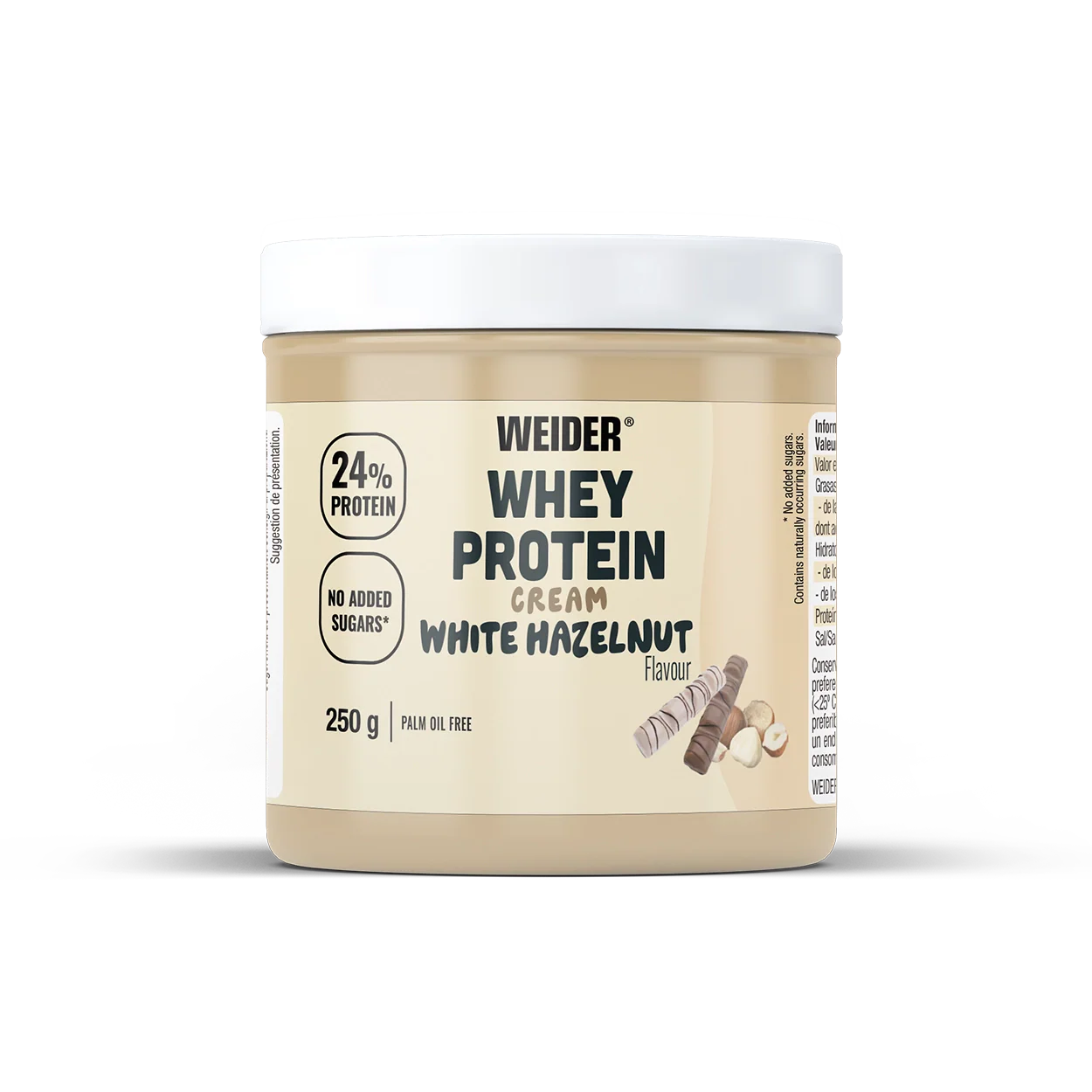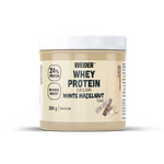 Spread with whey protein concentrate. With sweetener. White chocolate-hazelnut flavor.