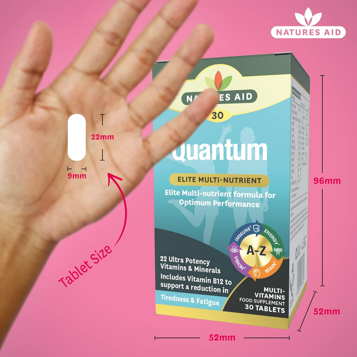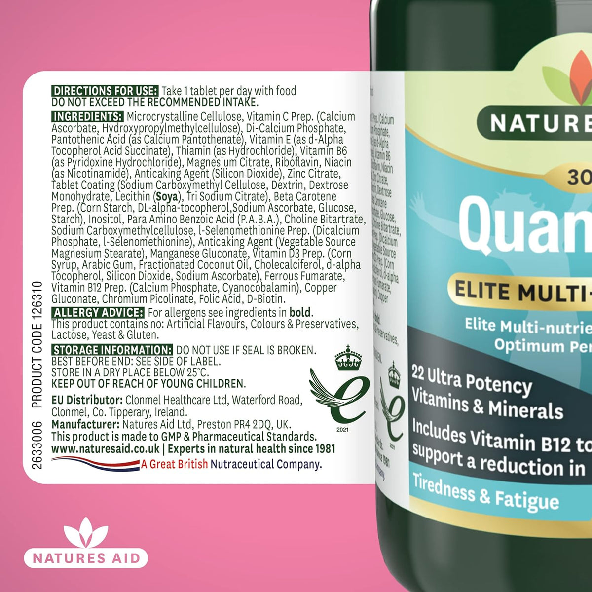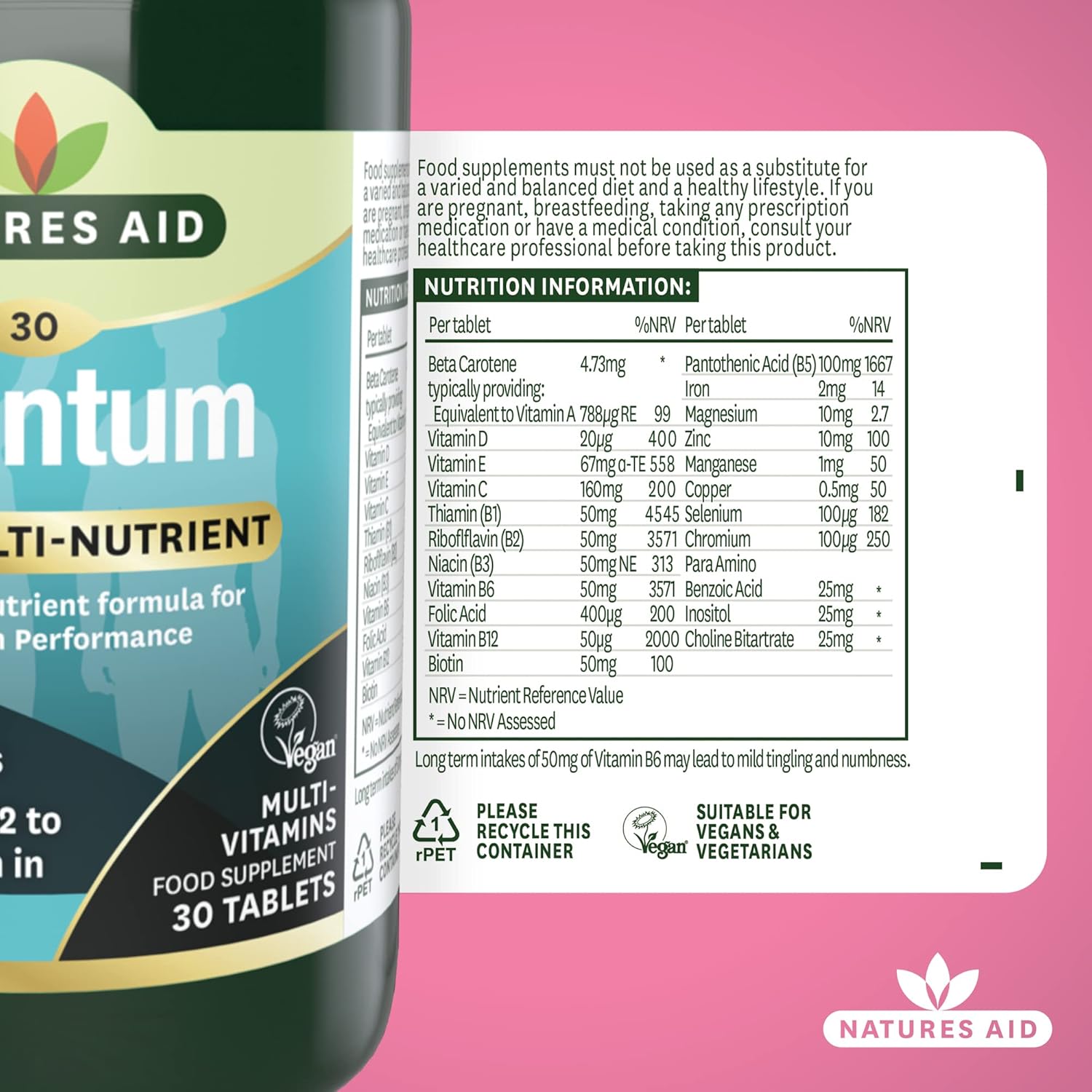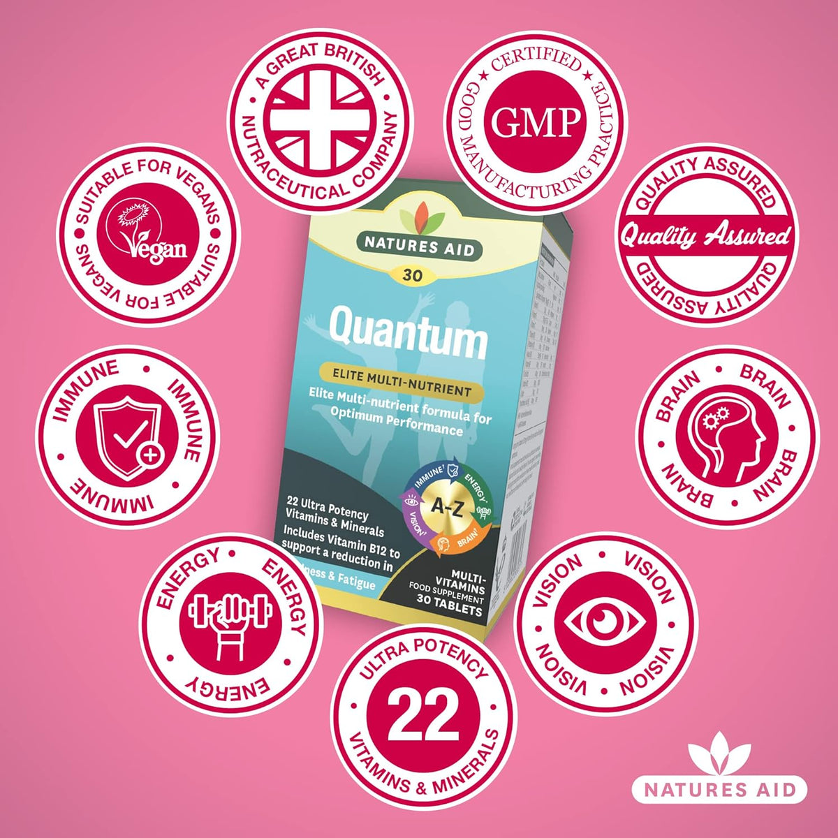 Natures Aid Quantum is an elite, ultra potent, daily multi-vitamin and mineral formula to support optimum performance. This high strength multi-vitamin and mineral includes nutrients such as B vitamin Complex to help support a reduction in tiredness and fatigue, normal energy-yielding metabolism and normal functioning of the nervous system. Vitamin B5 to support normal mental performance. Zinc to help maintain normal cognitive function, normal vision, normal hair, skin and nails and normal functioning of the immune system. Selenium to support normal thyroid function and to protect cells against oxidative stress. Chromium which maintains normal macronutrient metabolism and normal blood glucose levels. Available in 30 tablets.A high potency multi-vitamin and mineral formula for well-being and vitality