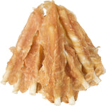 A rawhide stick covered with whole piece of chicken breast fillet. Let your dog have a great time chewing on a rawhide stick with the great taste of freshly cooked chicken.