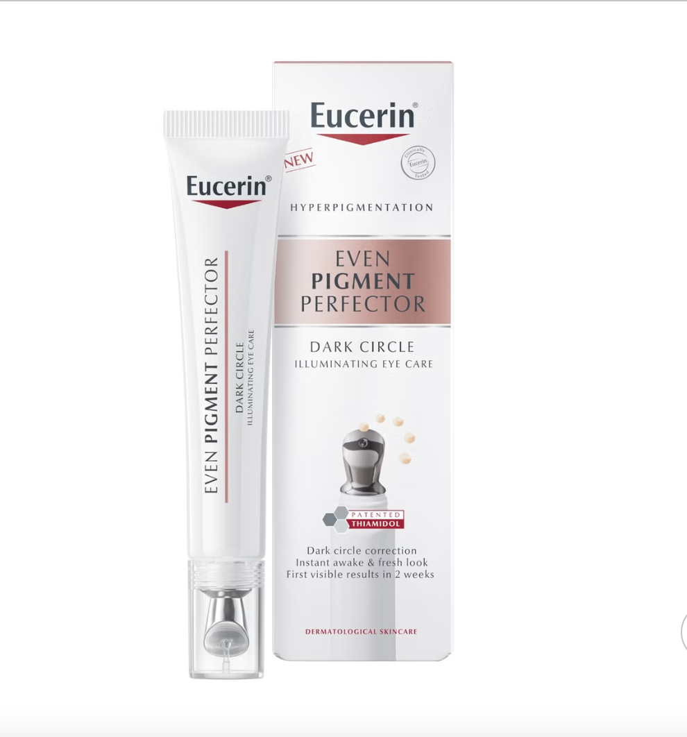 Even Pigment Perfector Dark Circle Illuminating Eye Care Melanin is a natural pigment that gives colour to skin. Exposure to sunlight, hormonal influences and ageing can cause an increase in melanin production and trigger hyperpigmentation. Hyperpigmentation appears as dark circles around the eyes, dark patches and age spots (also known as sun spots) that make skin look uneven. Eucerin Even Pigment Perfector Dark Circle Illuminating Eye Care combines powerful active ingredients that work in different ways to promote your skin’s radiance and reduce hyperpigmentation, and brightens and smooths your eye area at the source. The fresh and lightweight formula contains  Thiamidol, an effective and patented ingredient that acts at the root cause of hyperpigmentation by reducing melanin production. Light reflecting pigments to brighten your eye area for an instantly fresh awake look. Hyaluronic Acid reduces puffiness and smoothens fine lines. Oligopeptides stimulate the skin's collagen network for firmer skin structure. The cream can be applied easily and precisely to small areas of hyperpigmentation and has a cooling metal applicator for optimal performance. In just two weeks first results are visible with skin appearing smoother and more even, refined and with a fresh and awake look.