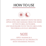 Put a pea sized amount onto the metal applicator and use the applicator to apply above and below the eye.