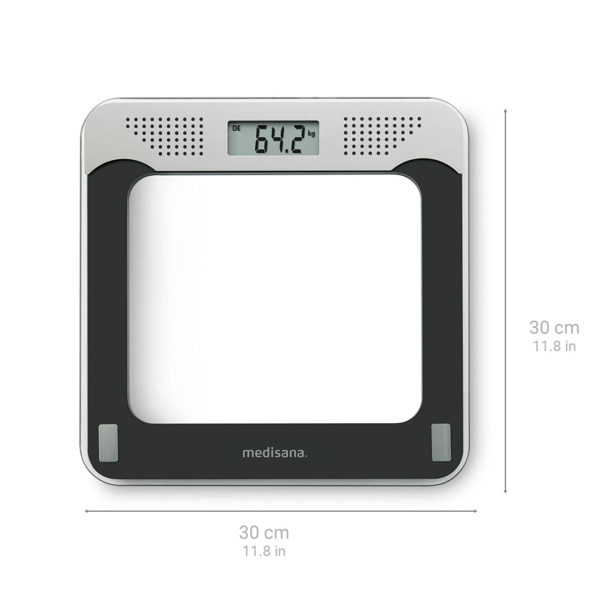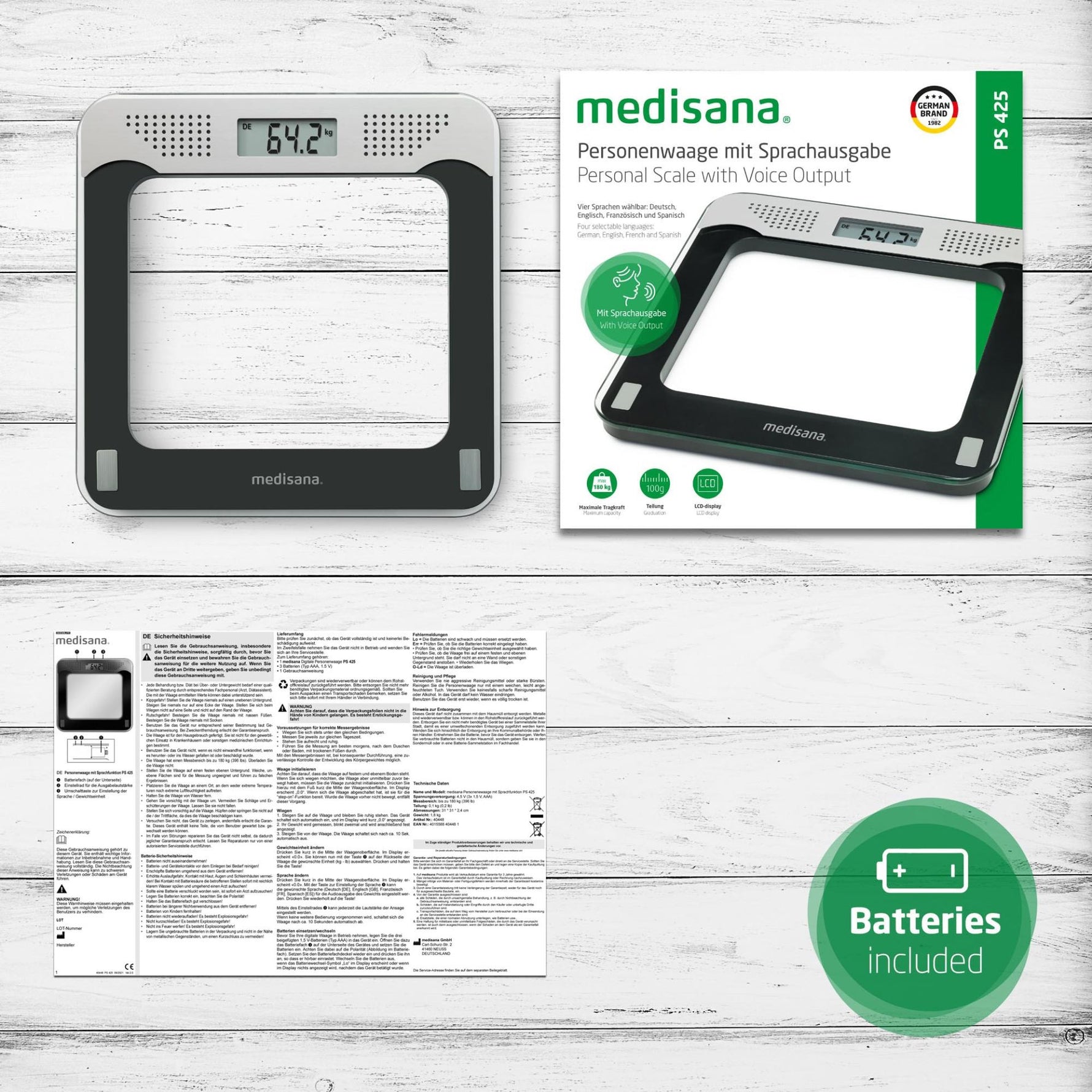 The special feature of the Medisana PS 425 personal scale is that, in addition to the easy-to-read LCD display, it also offers voice output in four languages: German, English, French and Spanish. The talking scale provides loud and clear information about the current body weight and is therefore a great help, especially for the elderly, visually impaired or blind.